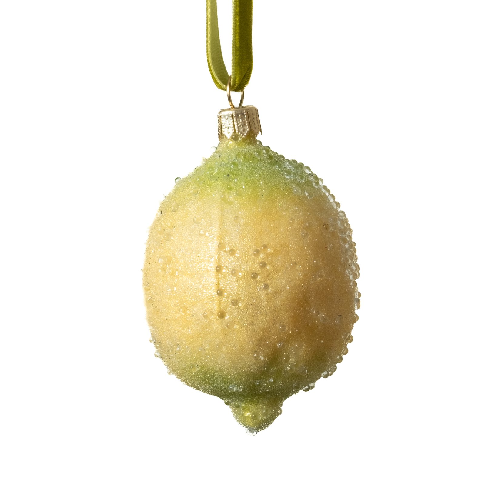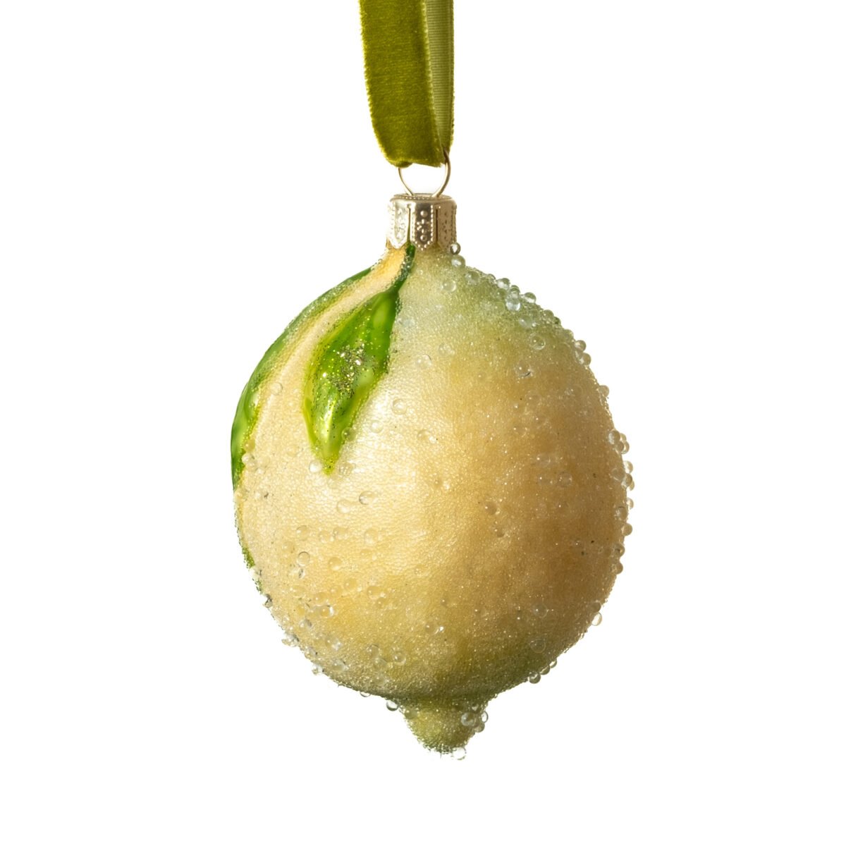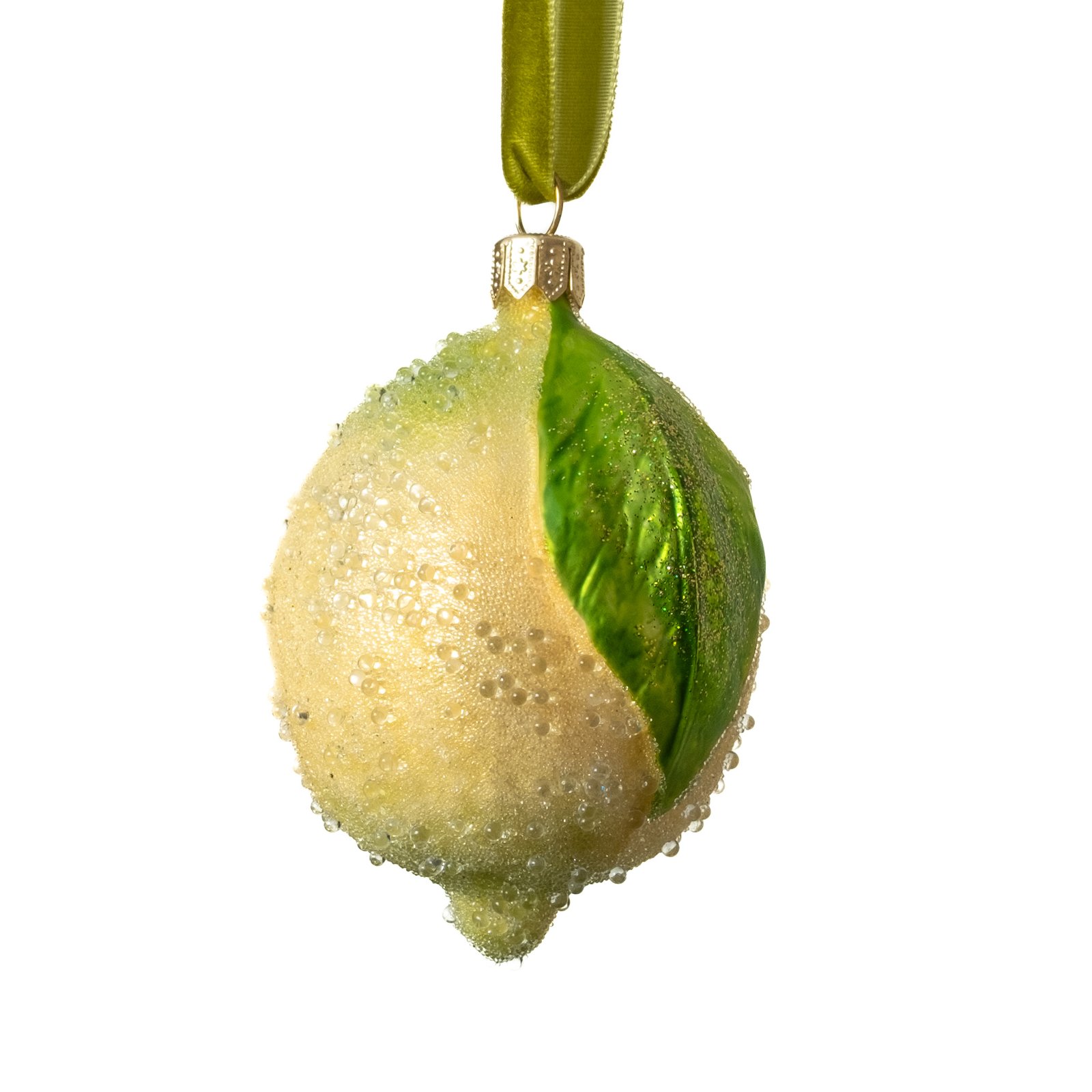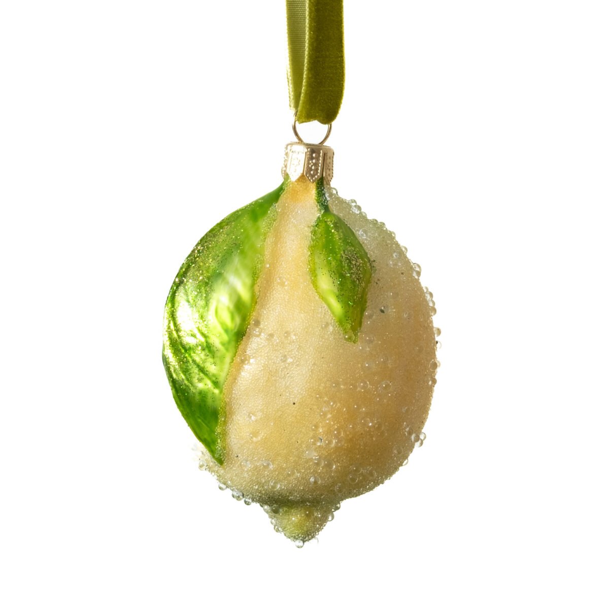 Blizgus citrinos žaisliukas, papuoštas lapeliais.