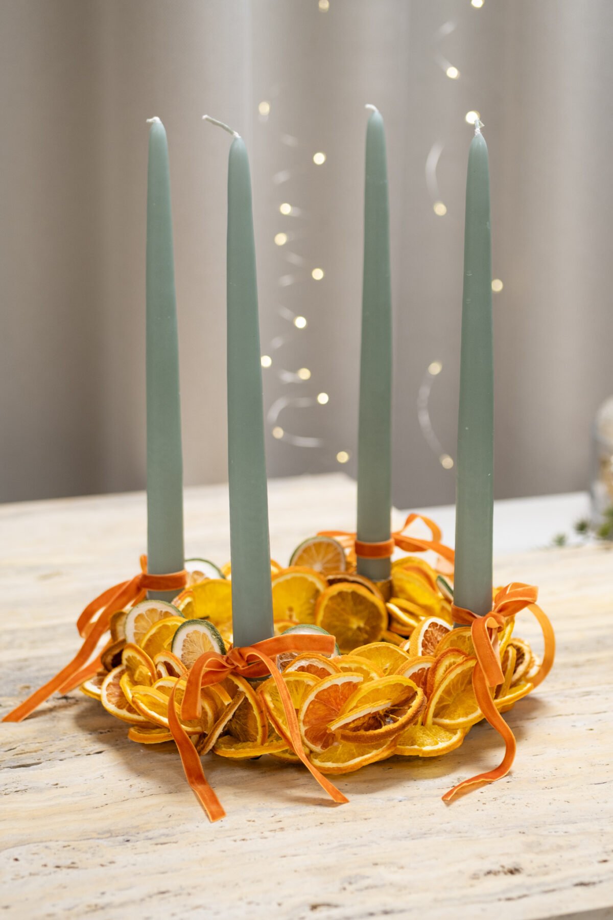 Šis advento vainikas – tikra citrusinių natų ir žiemos nuotaikos šventė. Jis sukurtas iš džiovintų apelsinų ir laimų, kurie pripildo erdvę lengvo, natūralaus aromato. Keturios žvakės – laukimo ir pasiruošimo Kalėdoms simbolis – subtiliai pabrėžia jaukumą ir šilumą namuose.