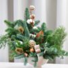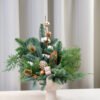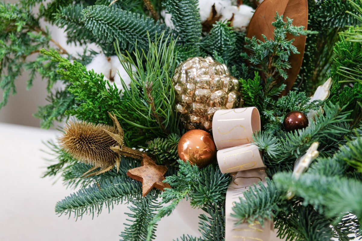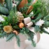 Spygliuočių šakų kompozicija, kurioje dera eglės ir kėnio šakos, medvilnės žiedai bei rudos spalvos akcentai.