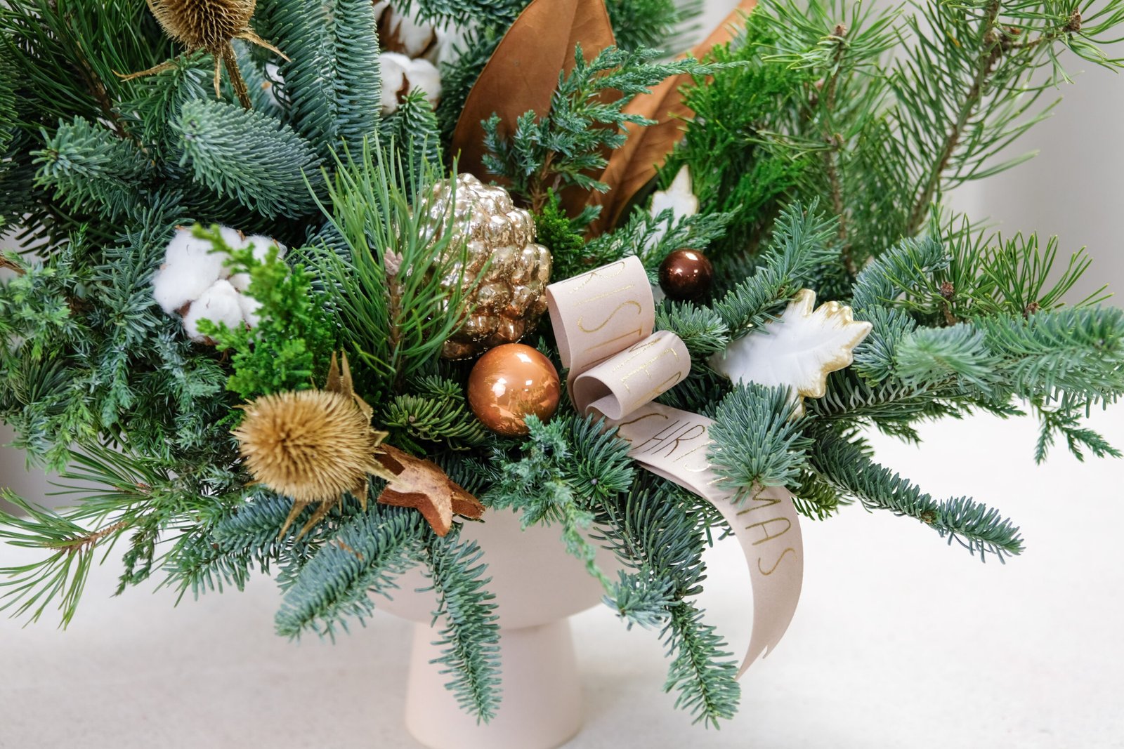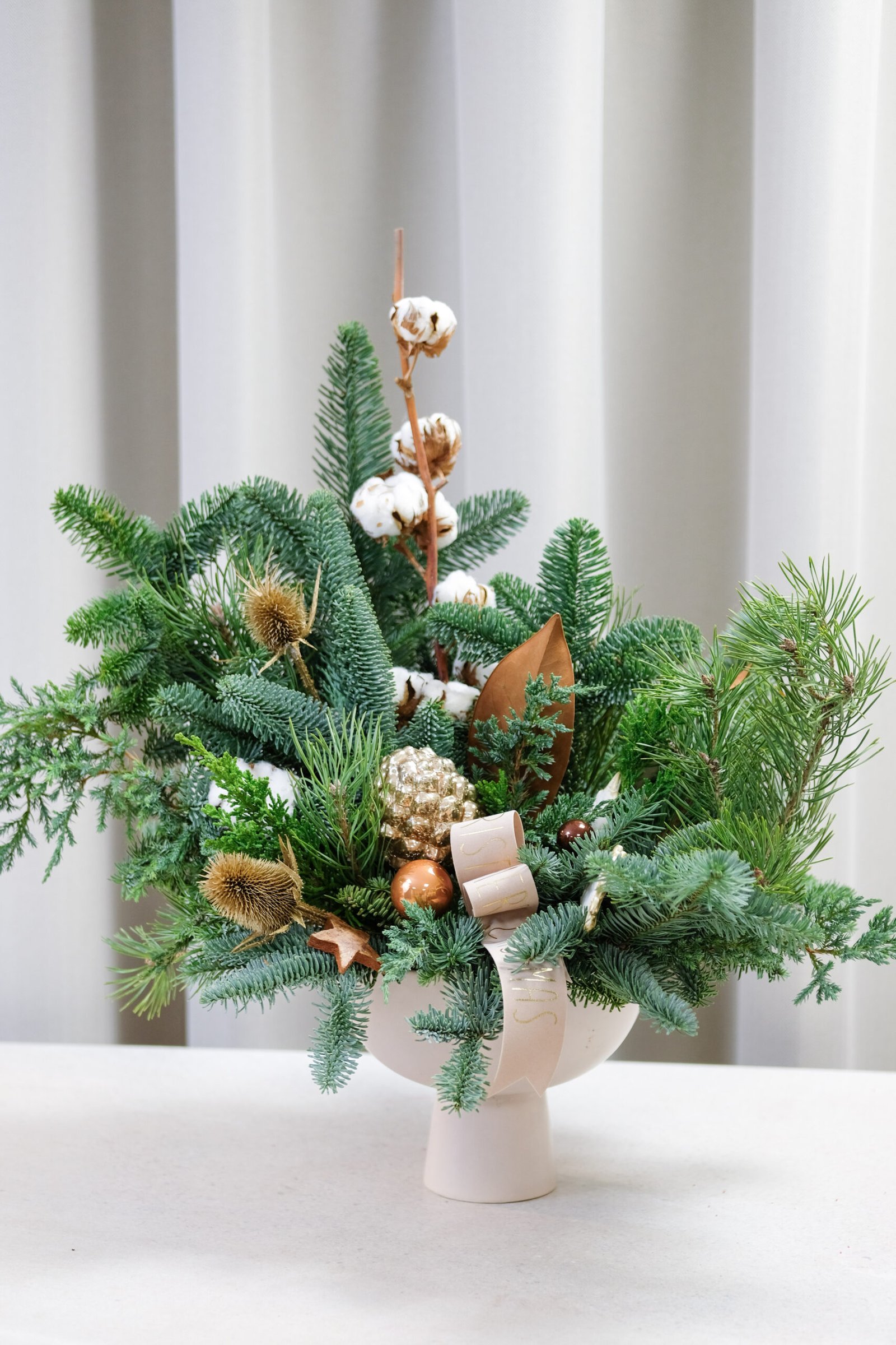 Spygliuočių šakų kompozicija, kurioje dera eglės ir kėnio šakos, medvilnės žiedai bei rudos spalvos akcentai.