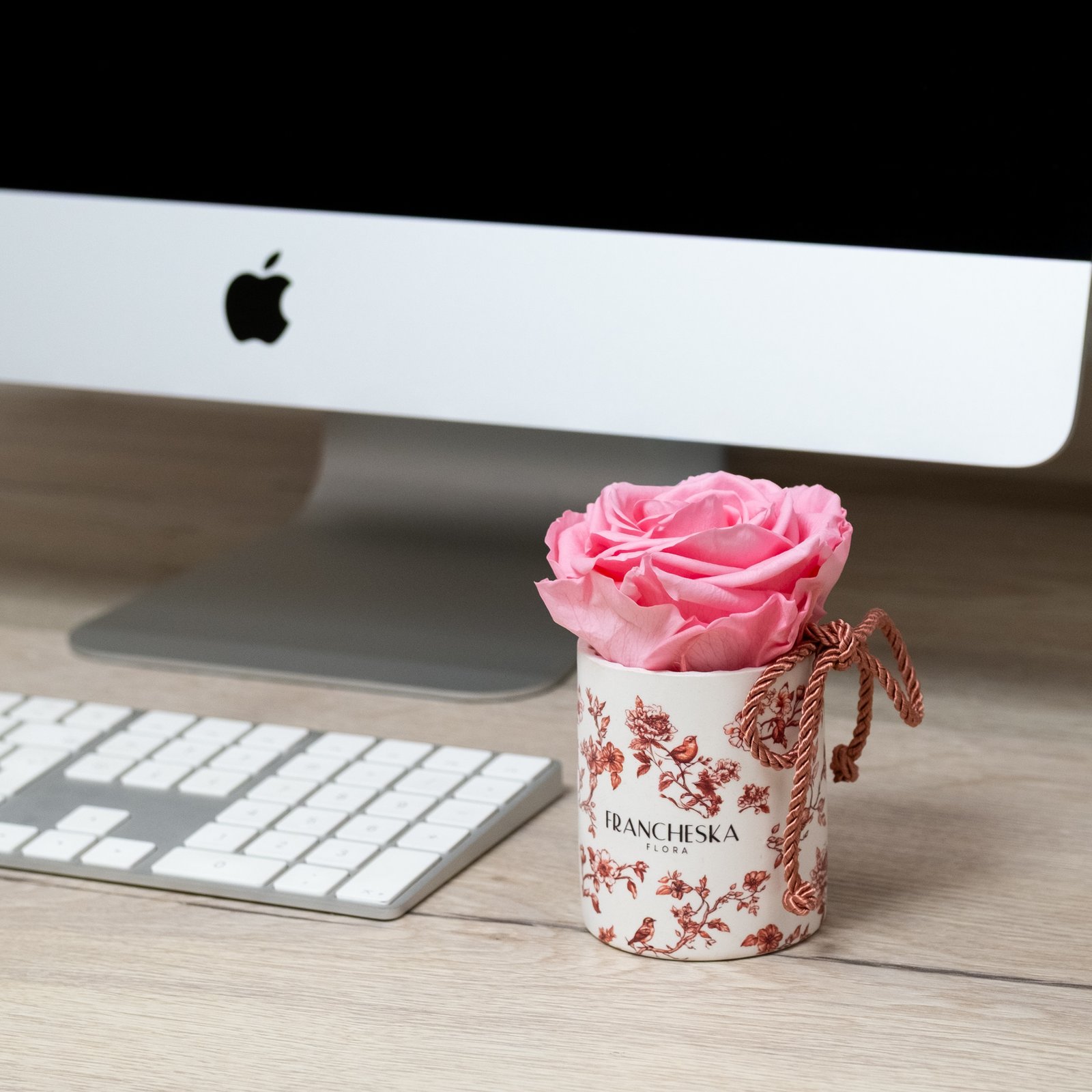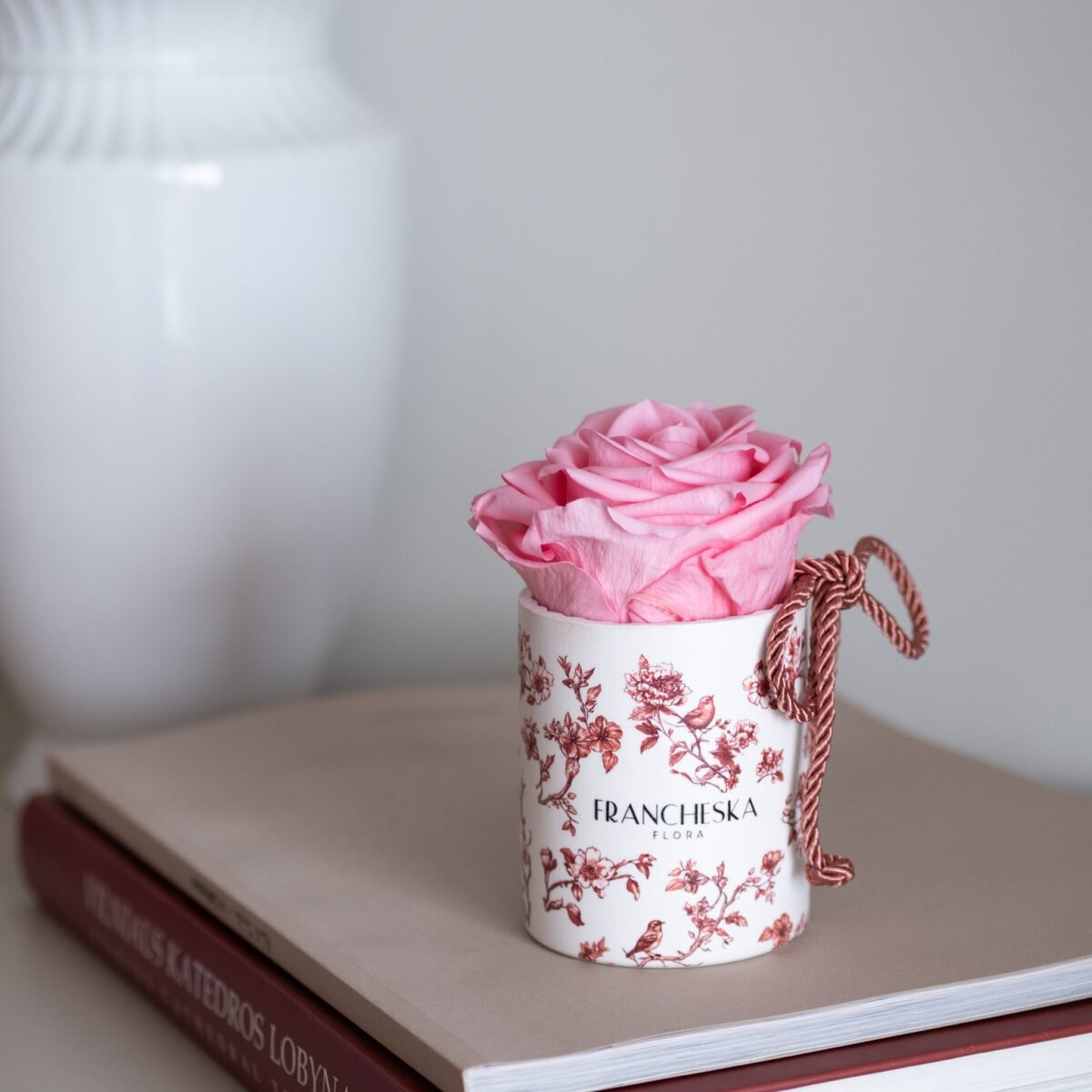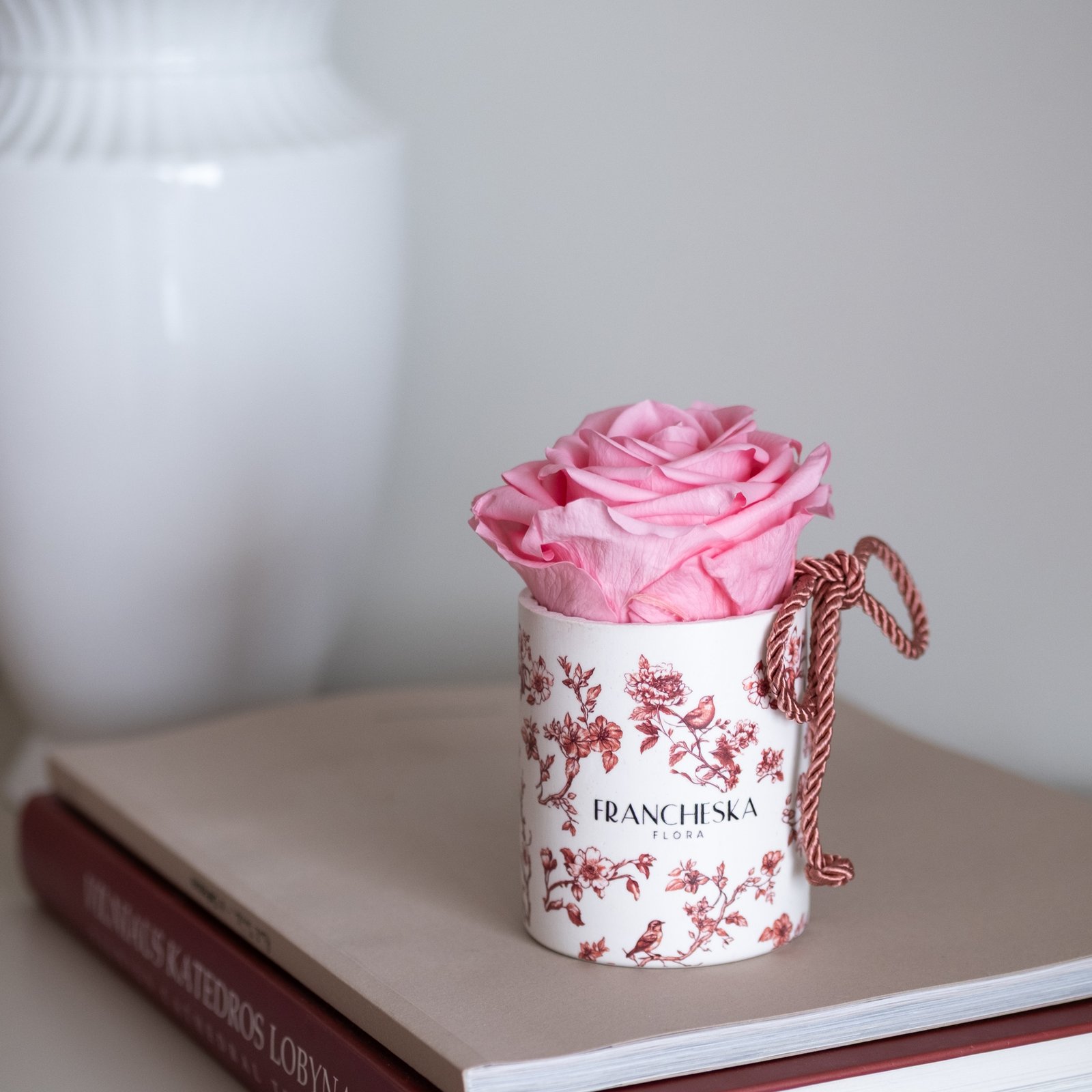Ši nedidelė , tačiau išskirtinė kompozicija su stabilizuota rože – tai ne tik interjero puošmena, bet ir subtilus difuzorius mažoms erdvėms, tokioms kaip vonios kambarys, miegamasis ar darbo kampelis.