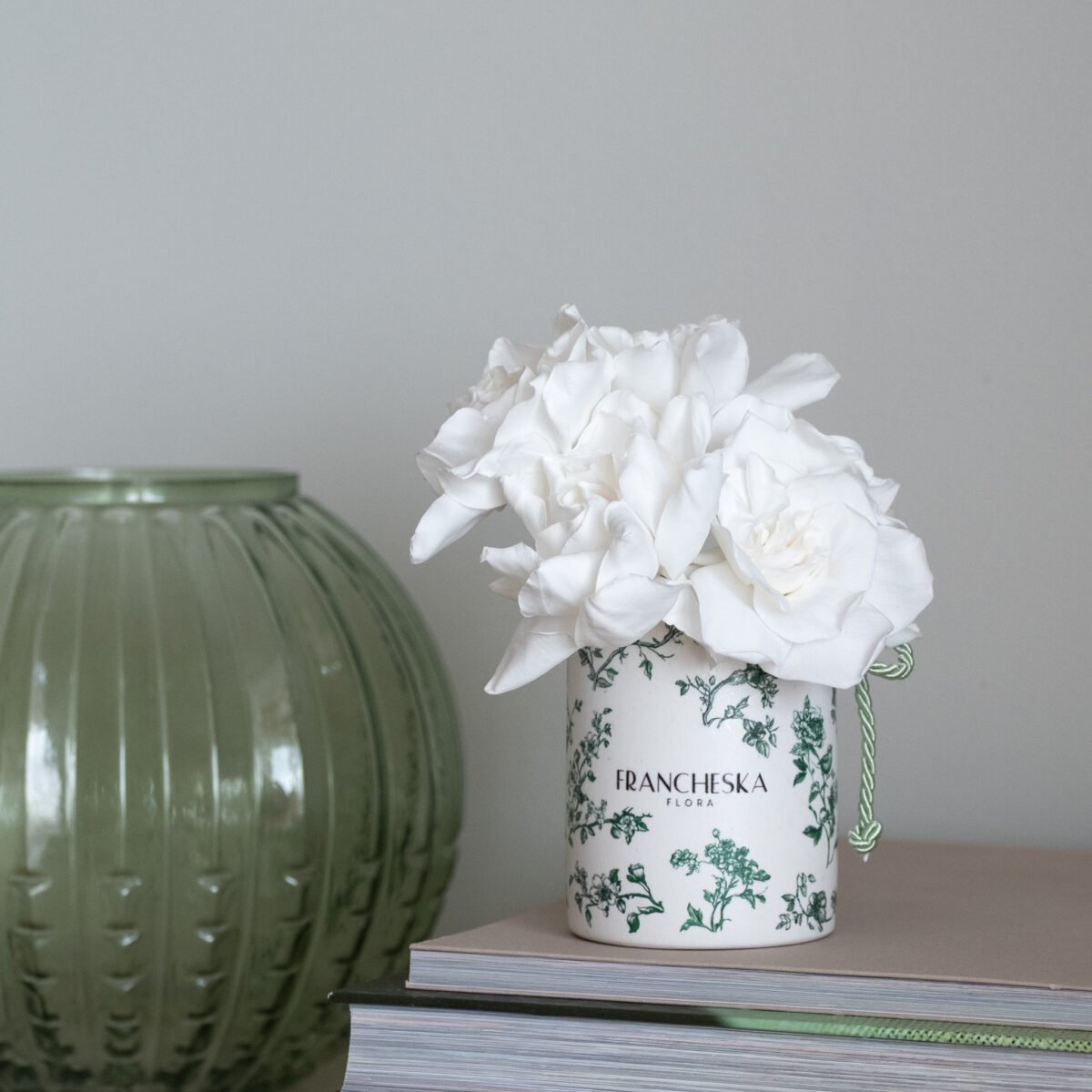 Kvapni stabilizuotų 5 baltų gardenijų kompozicija – difuzorius (žalia vazelė)