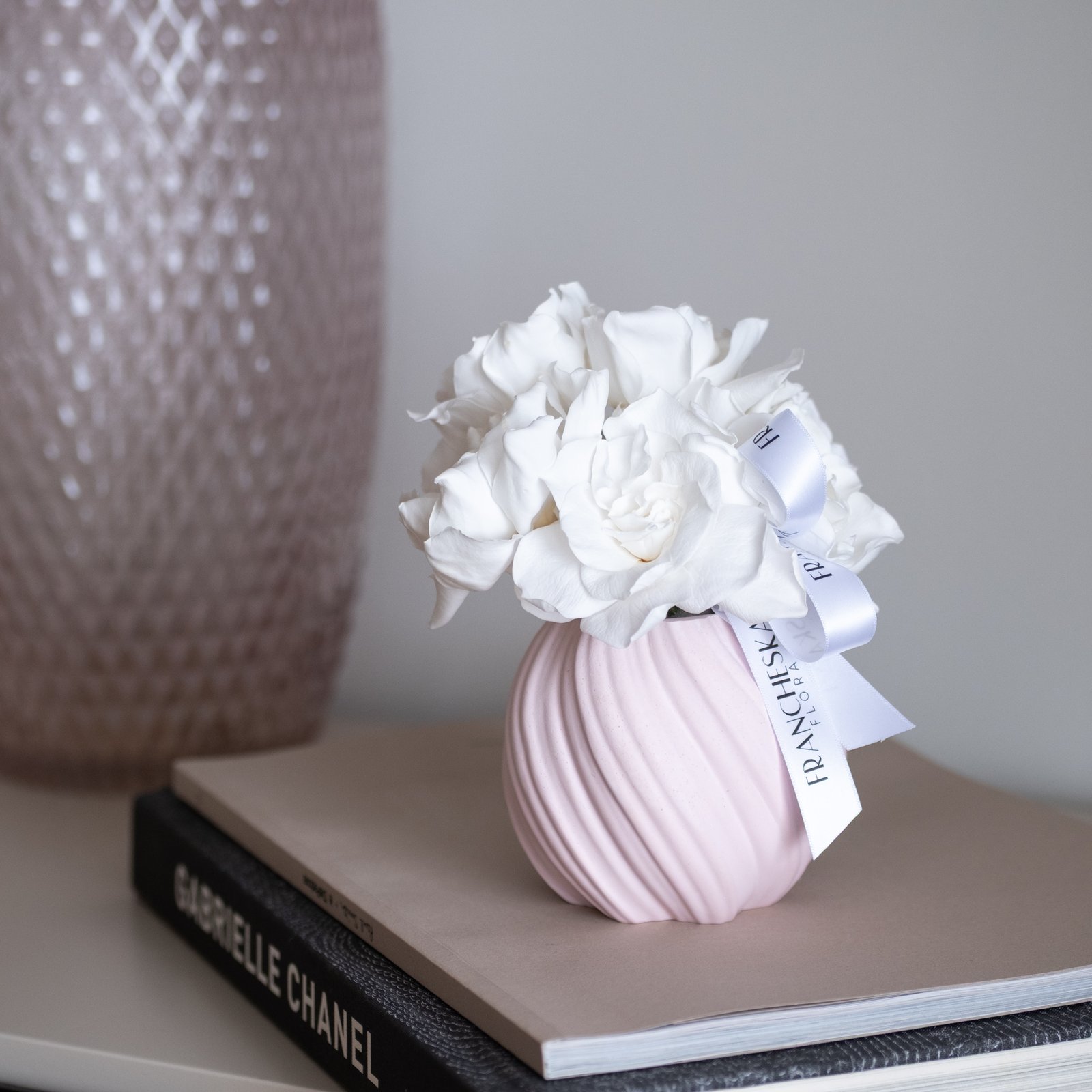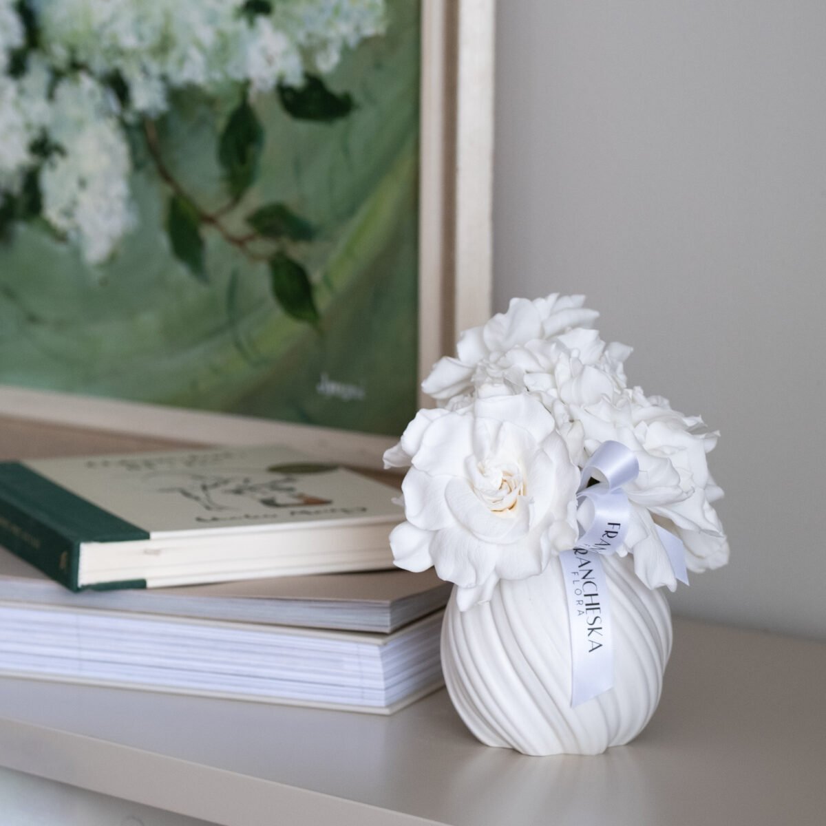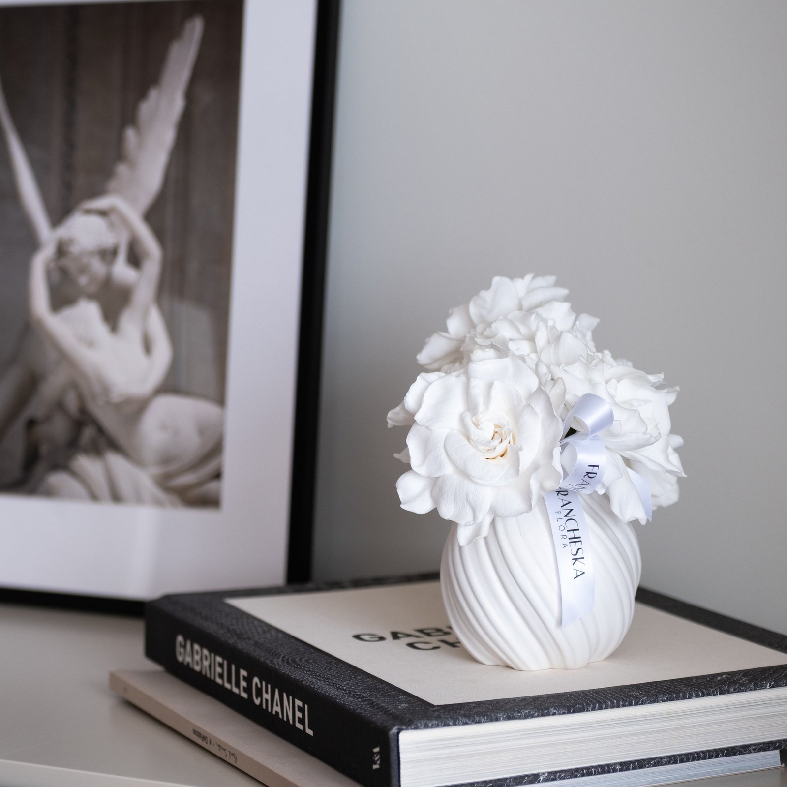 Ši nedidelė , tačiau išskirtinė kompozicija iš stabilizuotų gardenijų – tai ne tik interjero puošmena, bet ir subtilus difuzorius mažoms erdvėms, tokioms kaip vonios kambarys, miegamasis ar darbo kampelis.