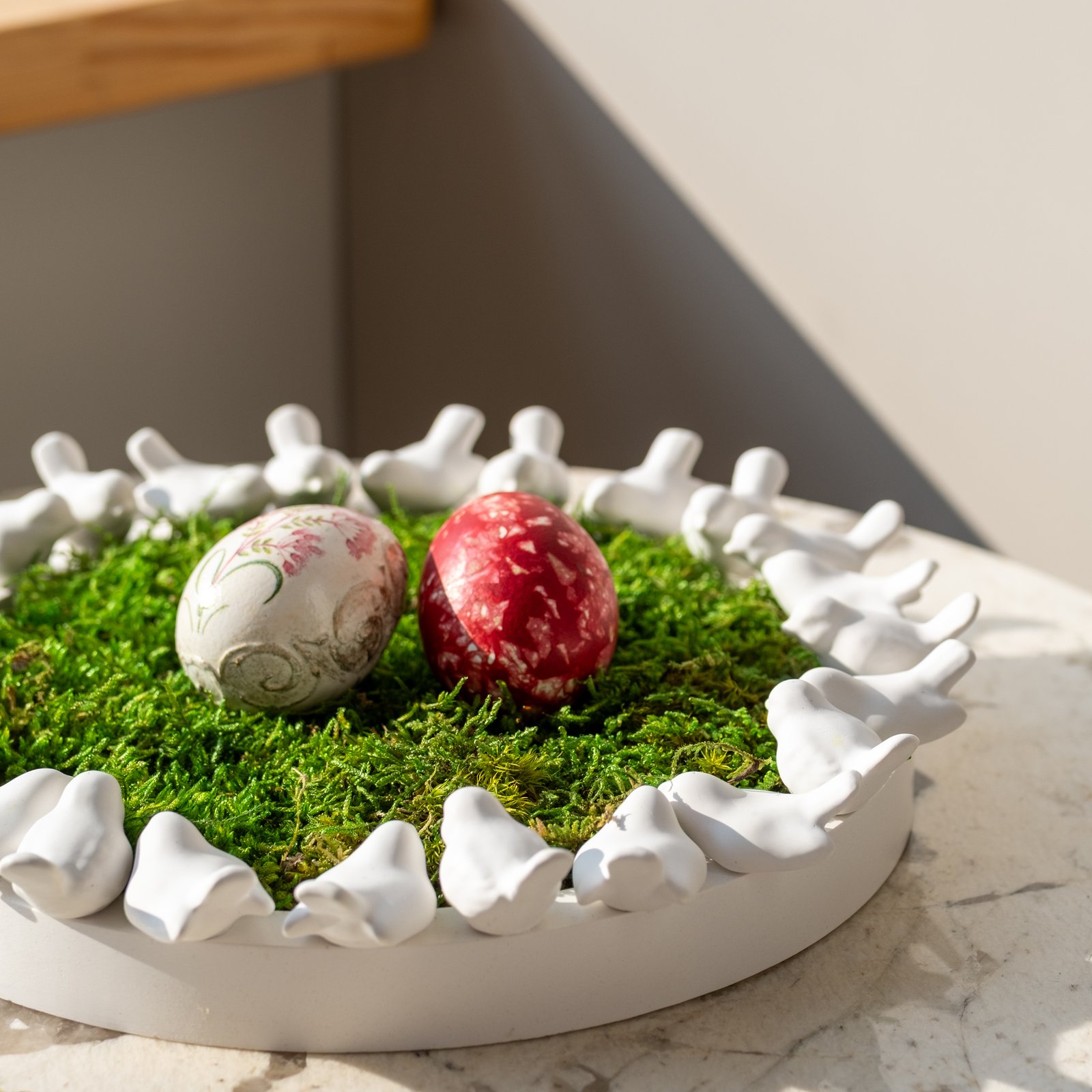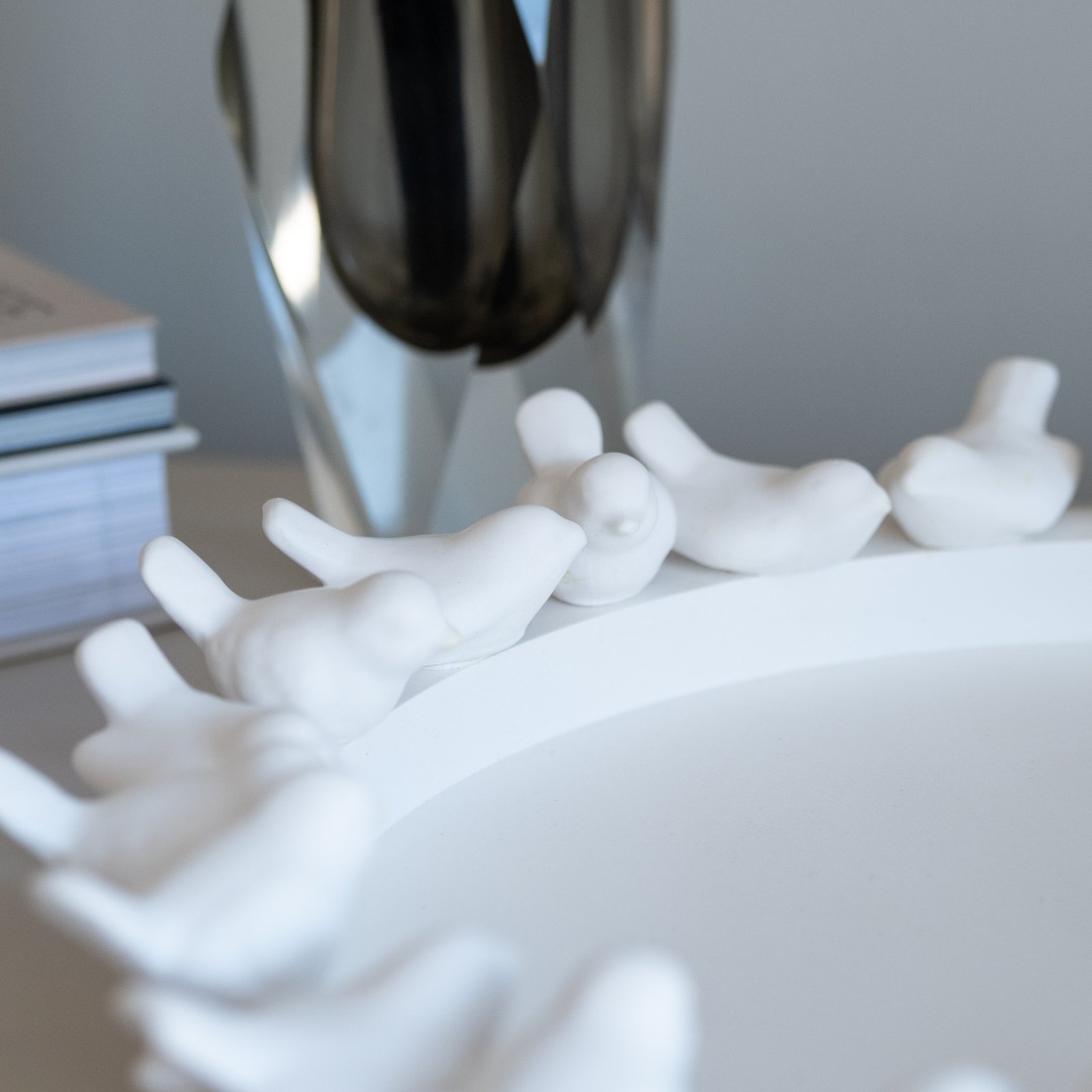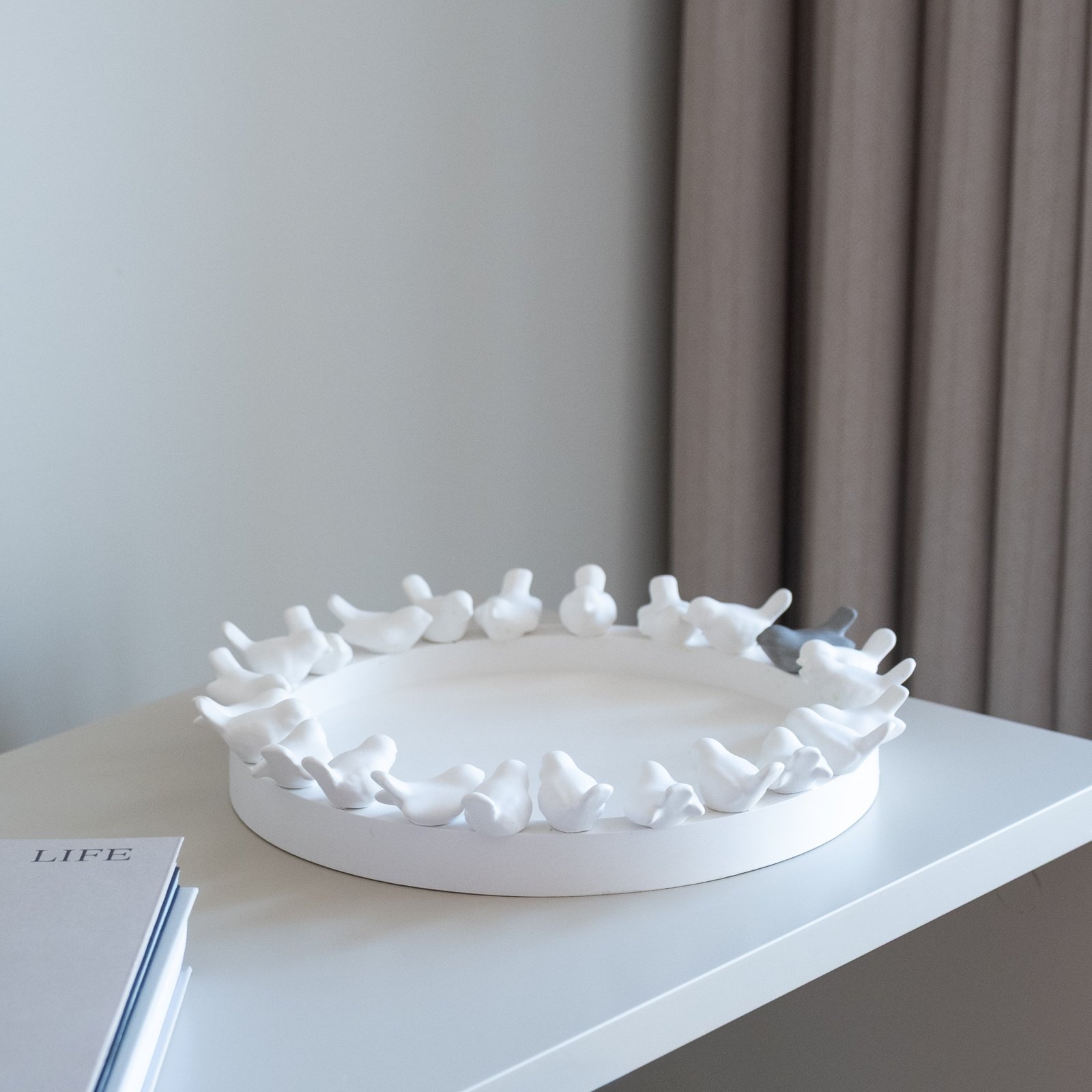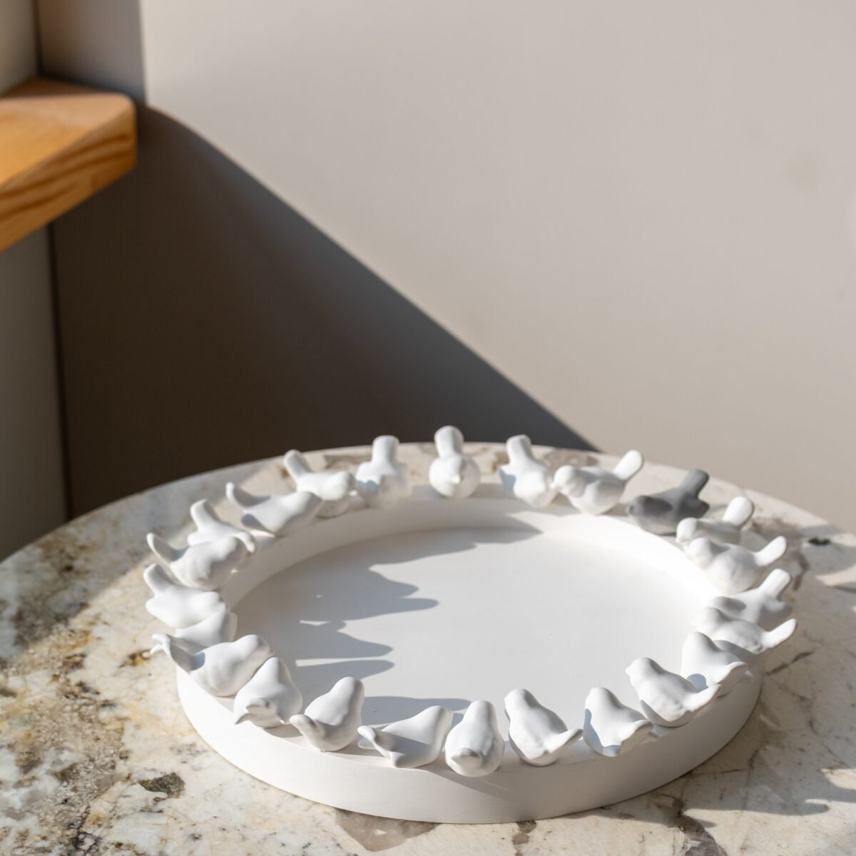 Dekoratyvinė rankų darbo lėkštė iš gipso, kurios kraštą puošia mažyčiai, subtilūs paukšteliai, tai ne tik jaukus interjero akcentas, bet ir prasminga detalė šventiniam stalui.Lėkštė puikiai tinka kaip dekoracija namams, o artėjant Velykoms gali tapti gražiu pagrindu margučiams – subtiliai papildys šventinę nuotaiką ir sukurs pavasarišką jaukumą.