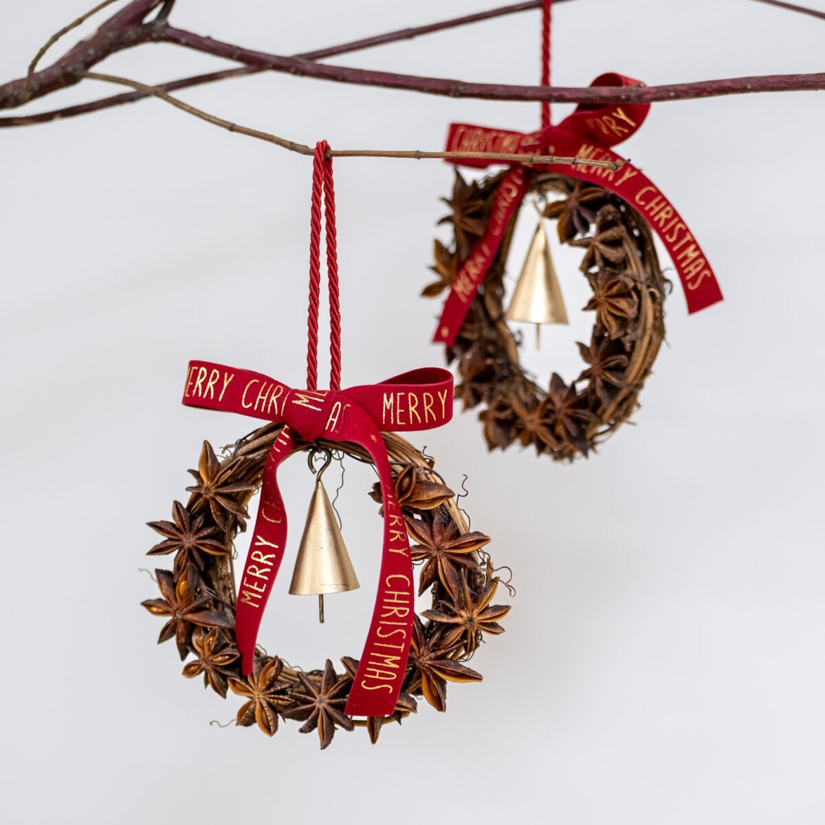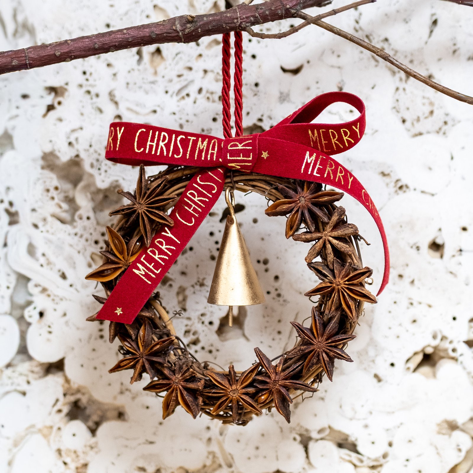 Vainikėlis iš žvaigždinio anyžiaus, puoštas raudonu aksominiu kaspinu ir varpeliu. Kvepiantis ir elegantiškas akcentas, kurį galima kabinti ant eglutės, indaujos ar durų rankenos.