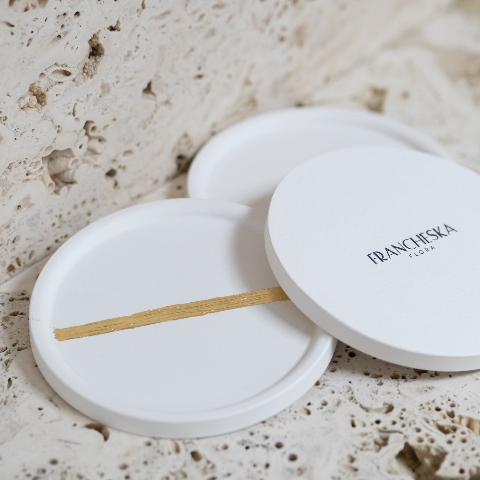 Subtilus, rankų darbo baltas padėkliukas iš gipso – puikus akcentas jūsų namų interjere. Tinka žvakėms, papuošalams ar smulkioms kvepiančioms dekoracijoms.