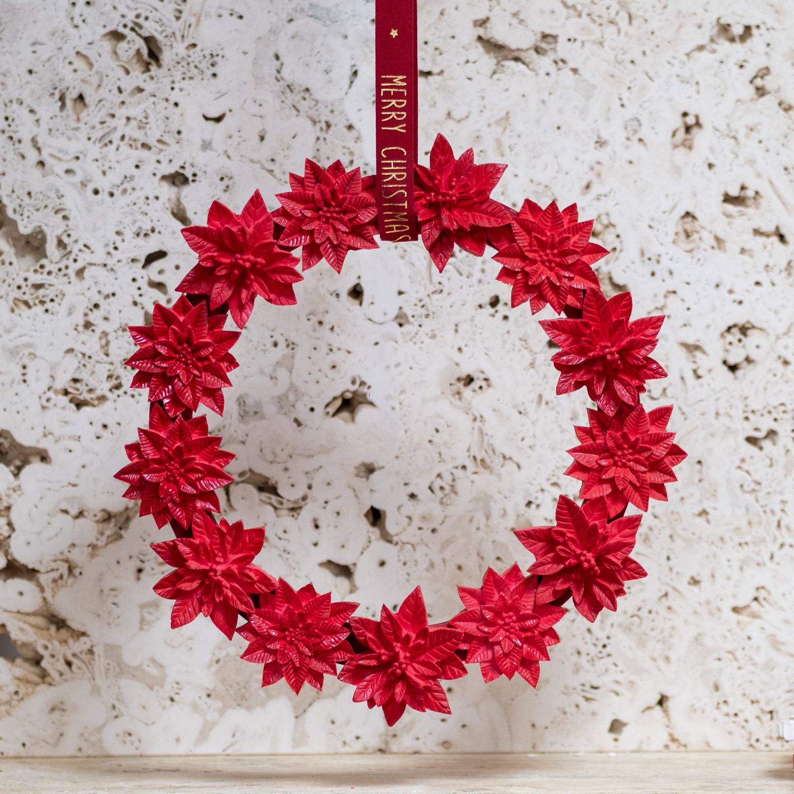 Rankų darbo gipso vainikėlis, sukurtas iš elegantiškų Puansetijų, kitaip dar vadinamų Kalėdų žvaigždėmis.