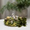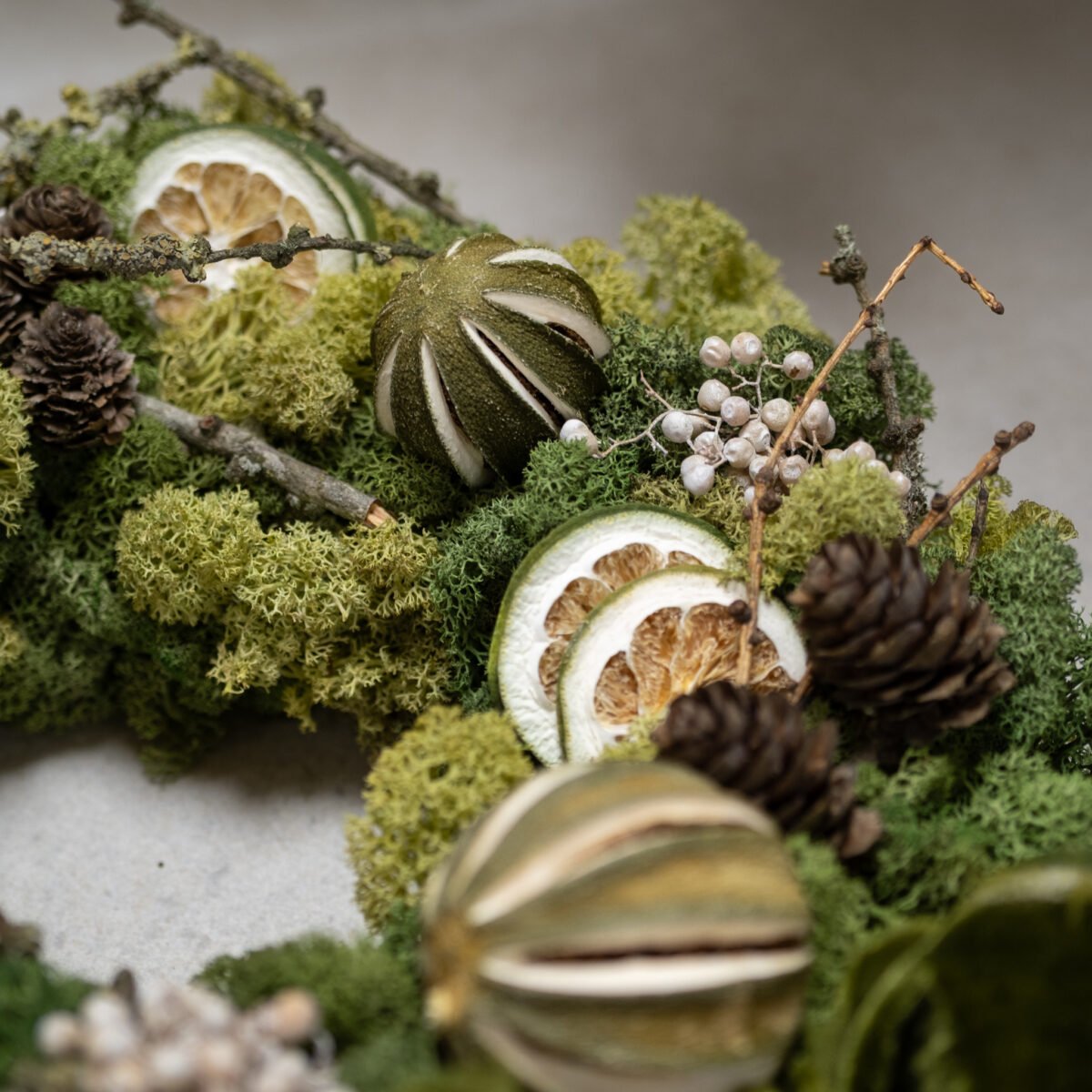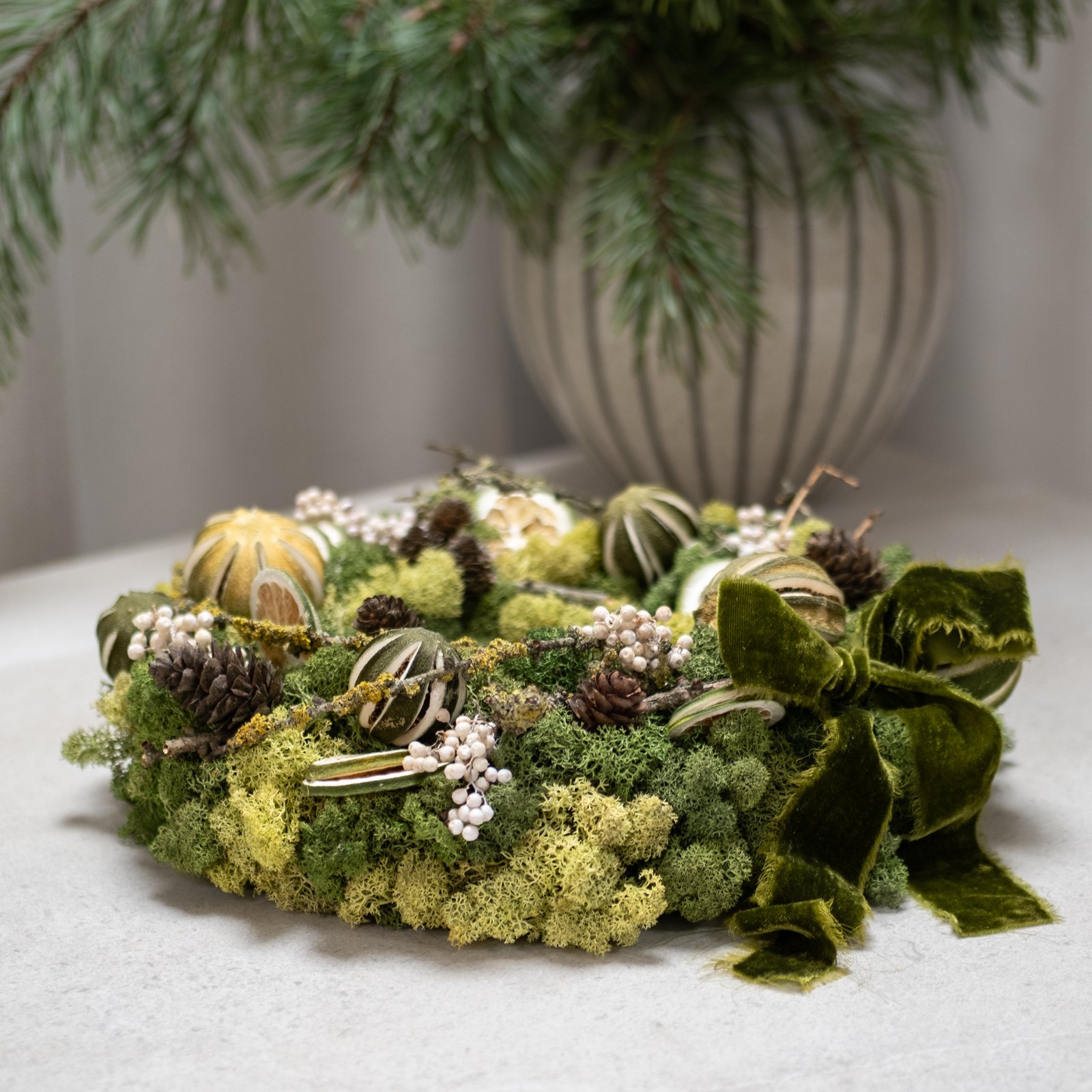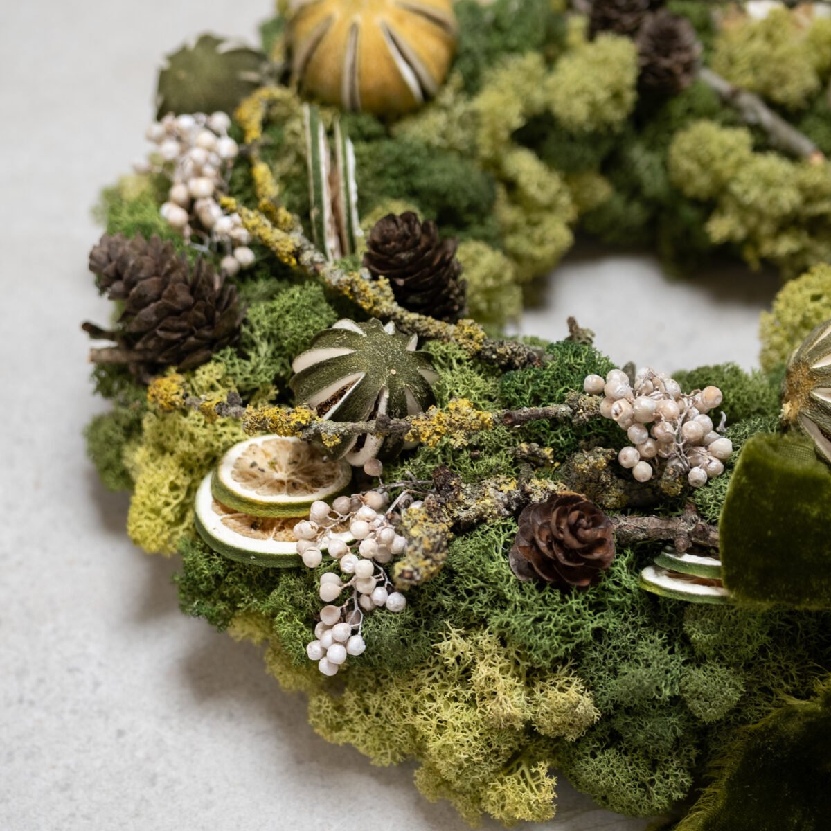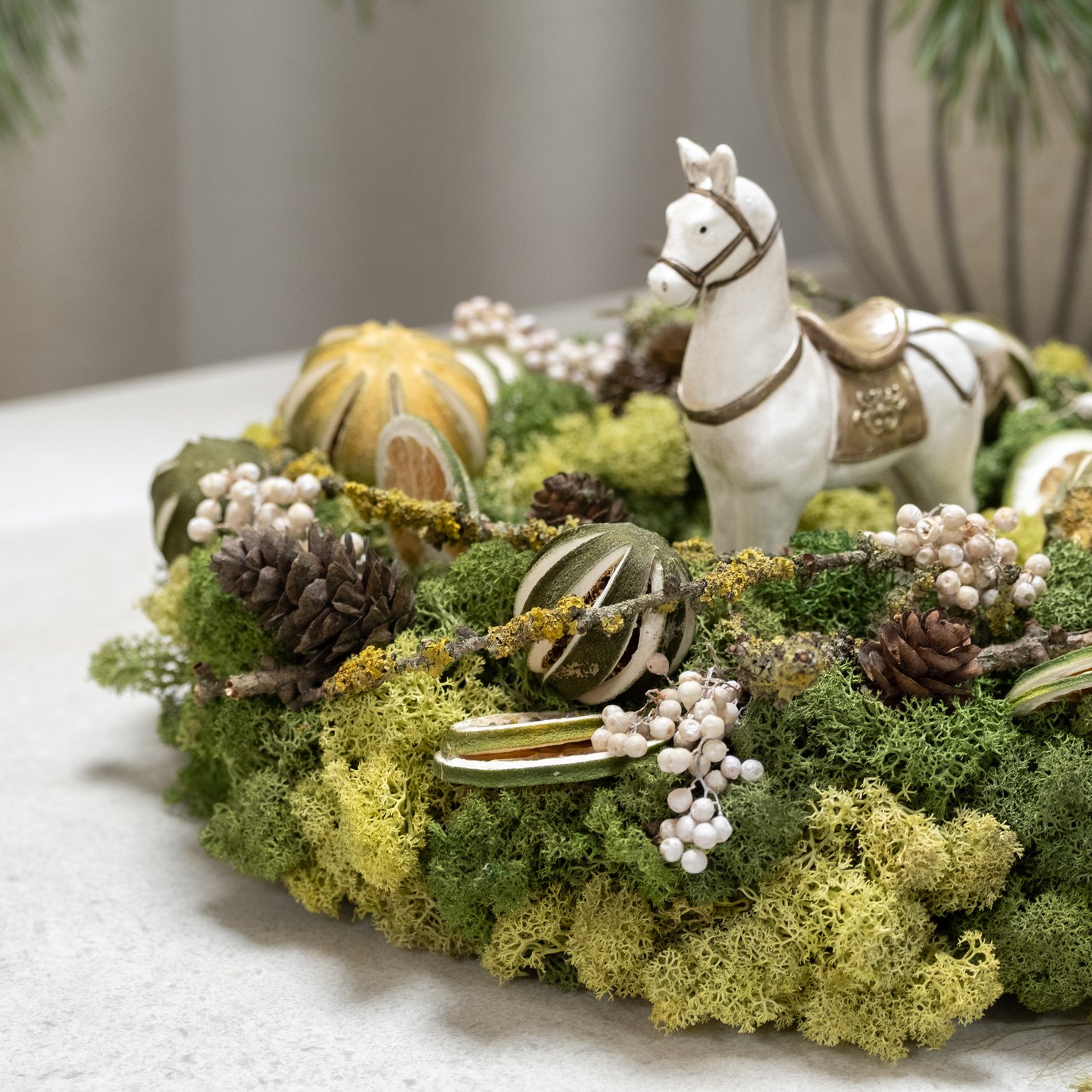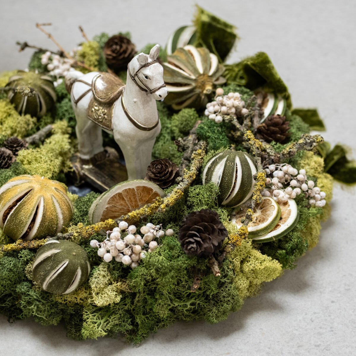 Natūralus stalo vainikas, kuriame susijungia samanų minkštumas, džiovintų apelsinų šiluma ir žiemiškų kankorėžių jaukumas. Švelnios uogos ir žaliai aksominė juosta suteikia kompozicijai šventiškos elegancijos. Norint – viduryje gali stovėti žaismingas arkliukas, kuriantis pasakišką nuotaiką.