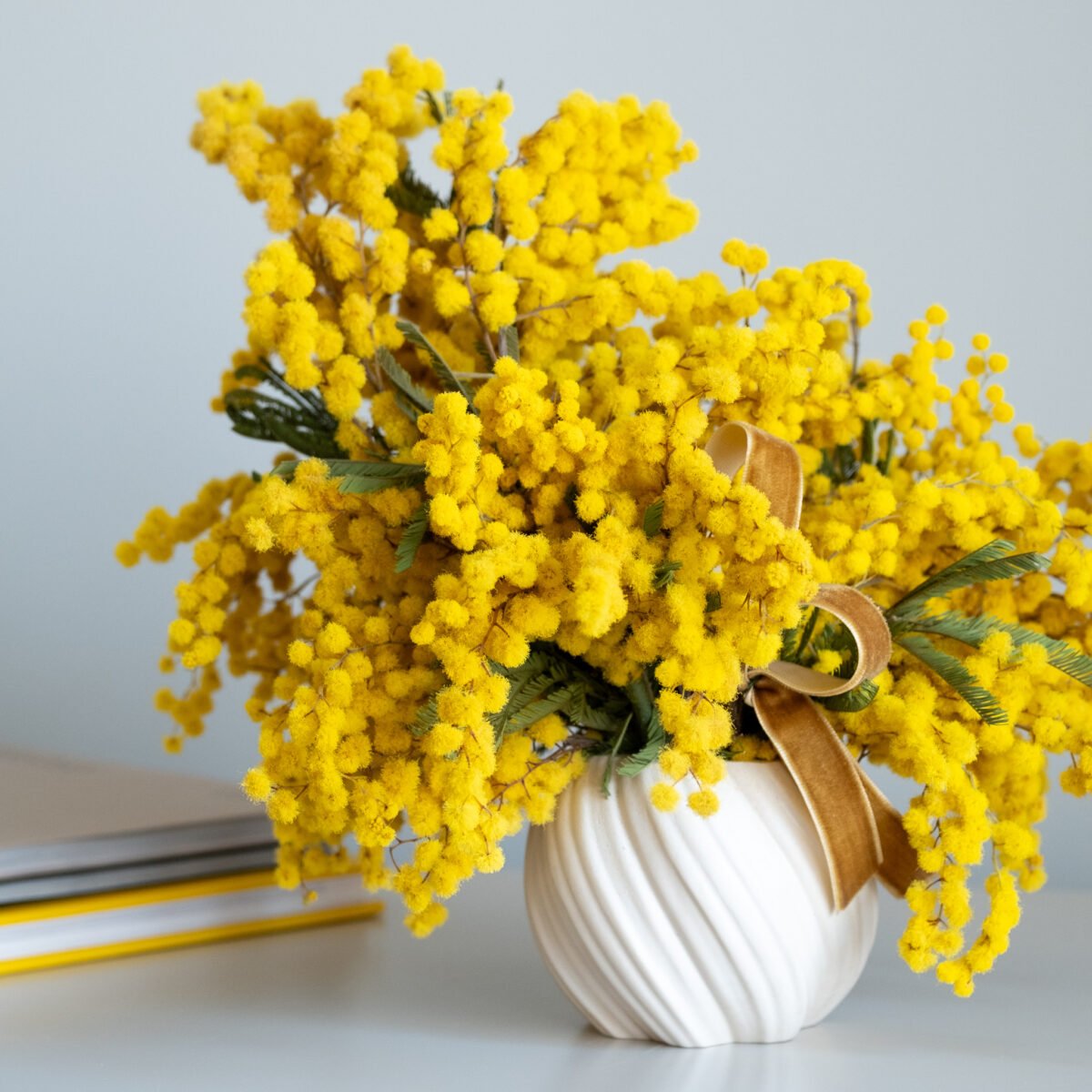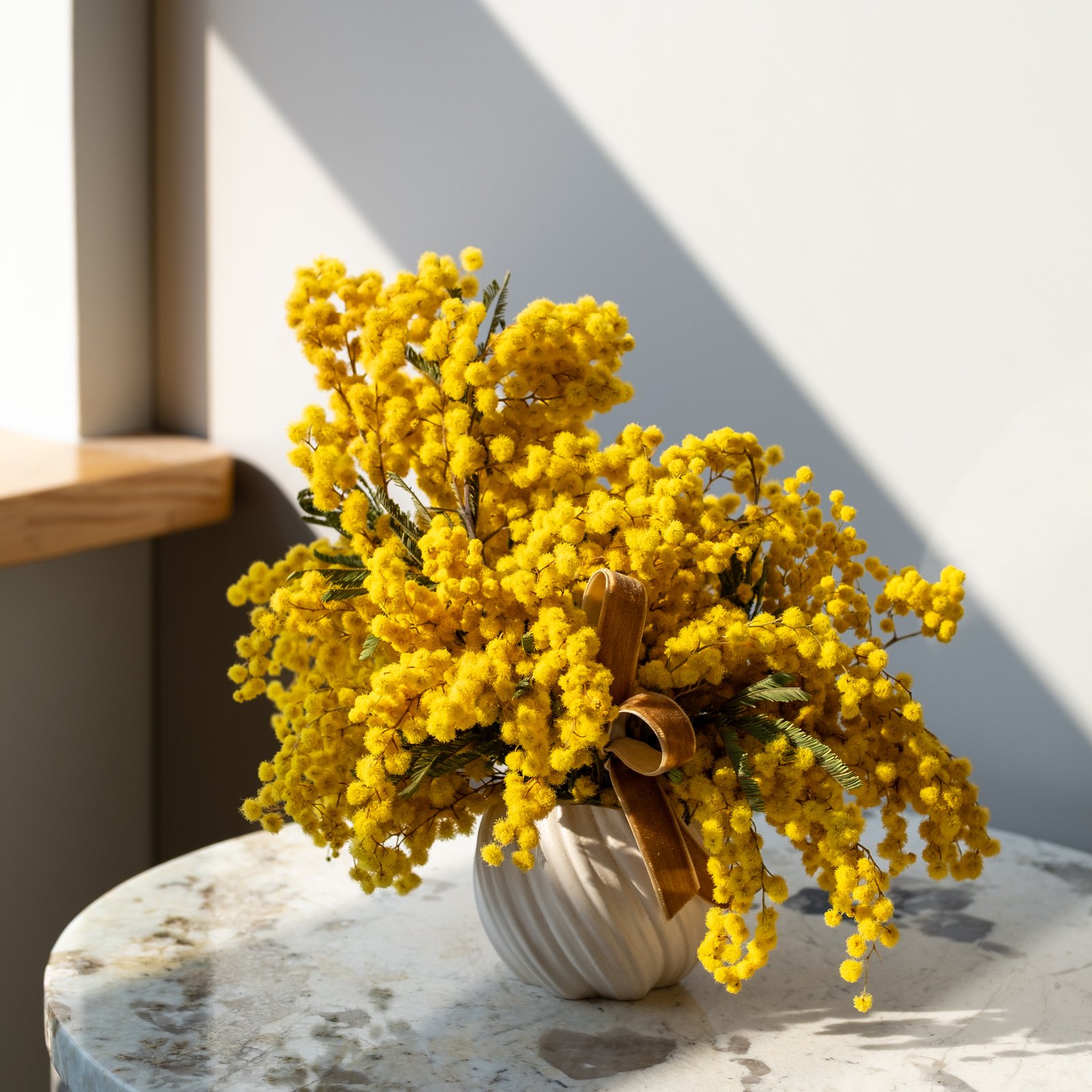 Subtili pavasarinė kompozicija iš stabilizuotos mimozos – lengva, šilta ir kupina saulėtos nuotaikos. Švelnūs geltoni žiedeliai suteikia namams jaukumo ir primena pirmąsias pavasario dienas.