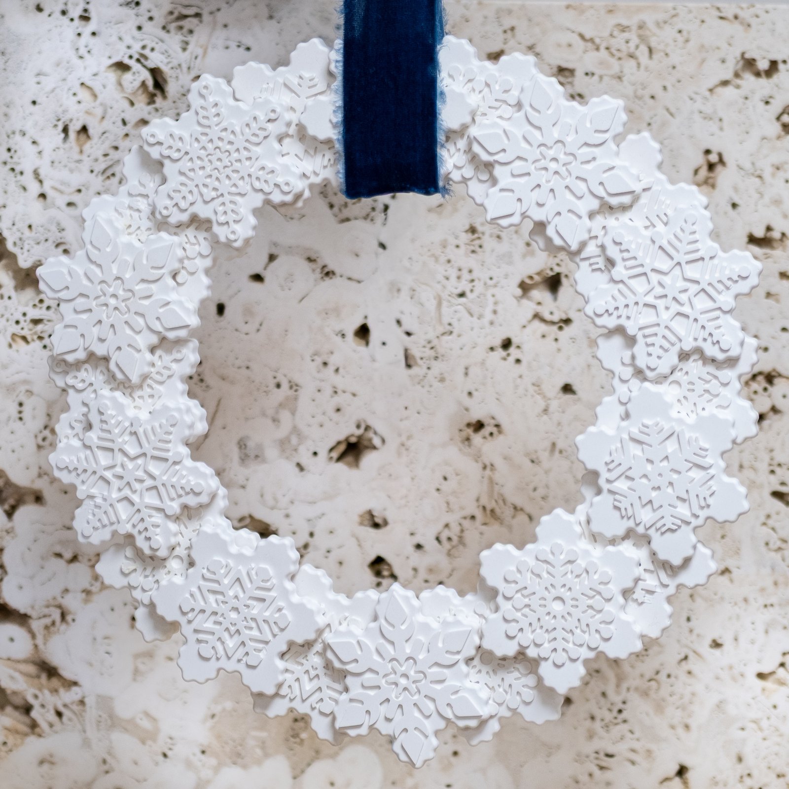 Elegantiškas rankų darbo vainikėlis, sukurtas iš baltų gipso snaigių, subtiliai žaismingas ir šventiškas.