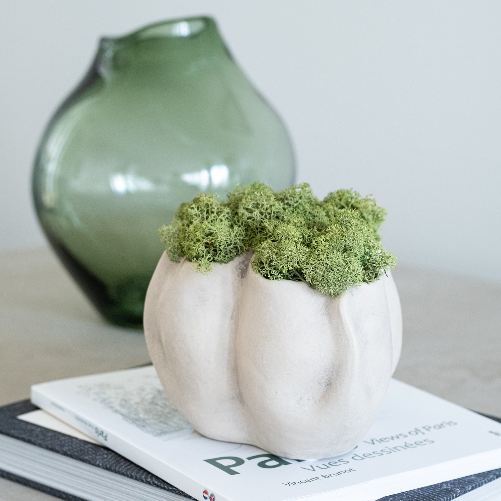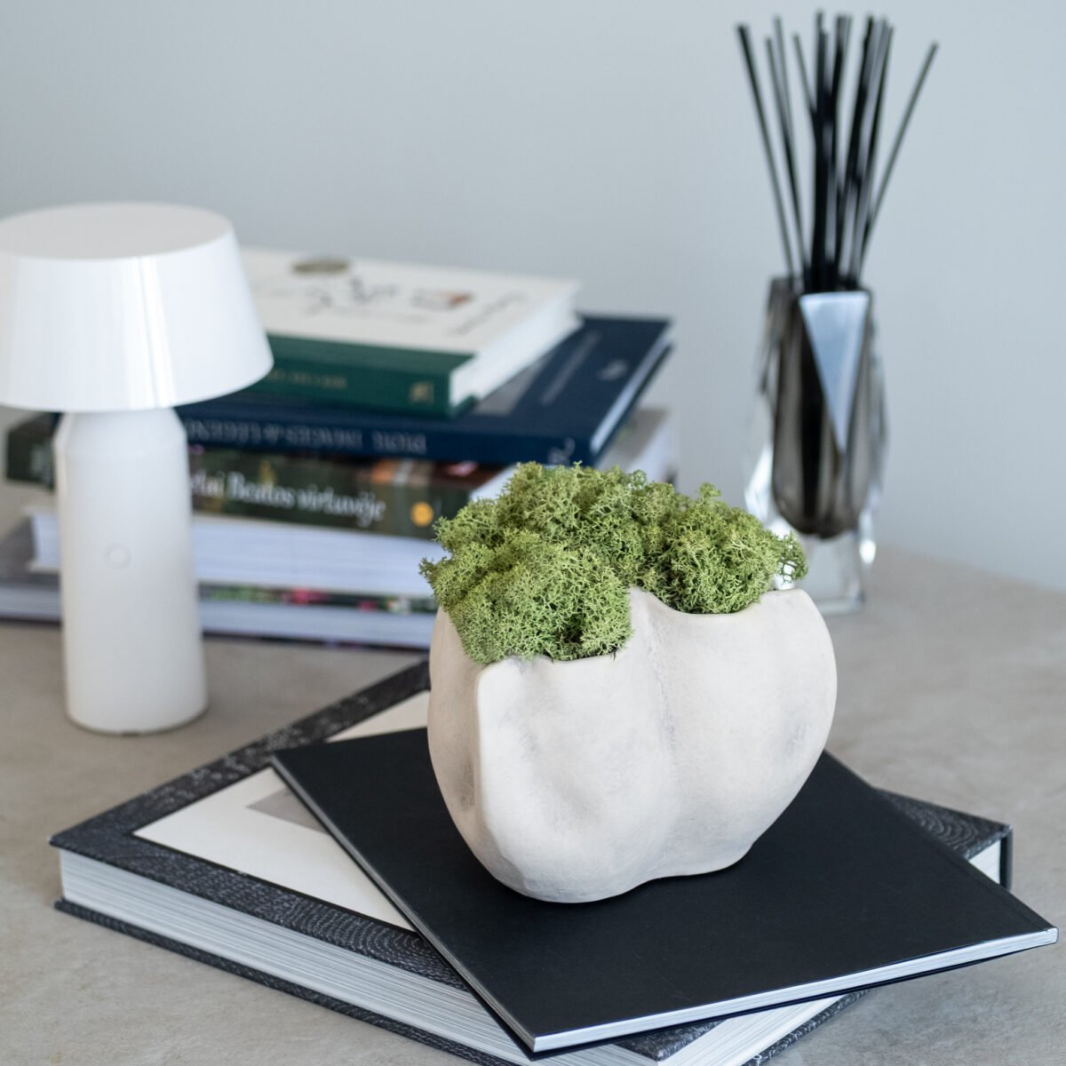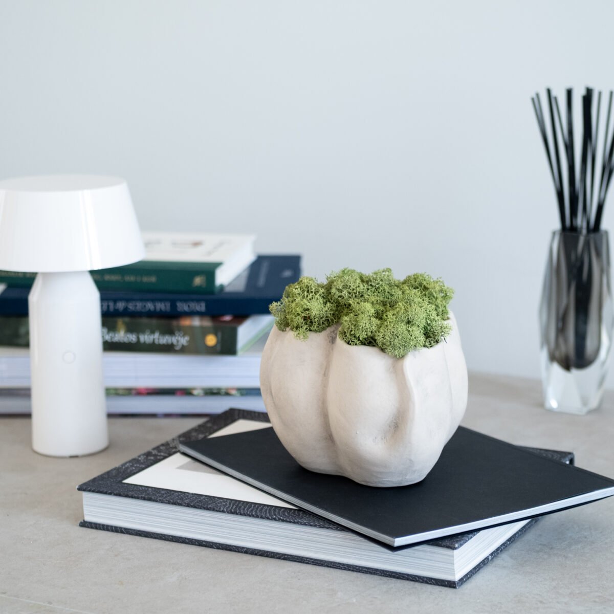 Modernios formos keramikinė vaza suteikia charakterio, o joje esantis stabilizuotas samanas įneša natūralumo ir jaukumo.