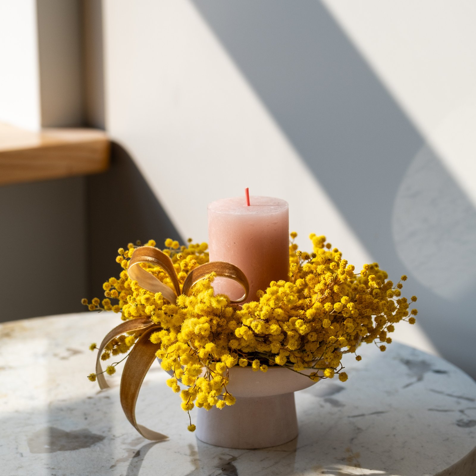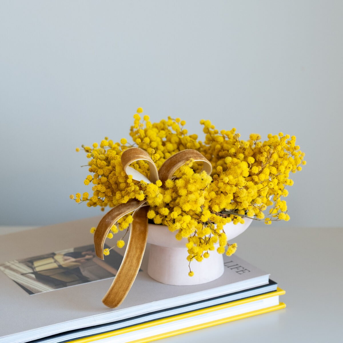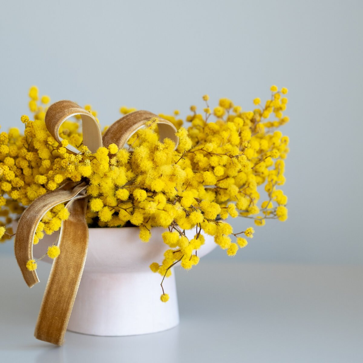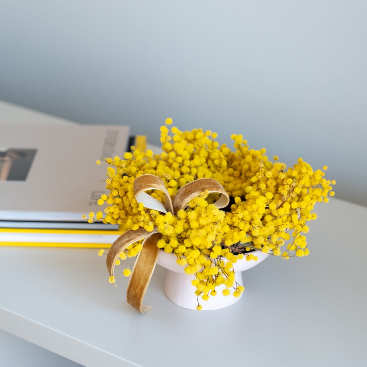 Subtili pavasarinė kompozicija iš stabilizuotos mimozos – lengva, šilta ir kupina saulėtos nuotaikos. Švelnūs geltoni žiedeliai suteikia namams jaukumo ir primena pirmąsias pavasario dienas.