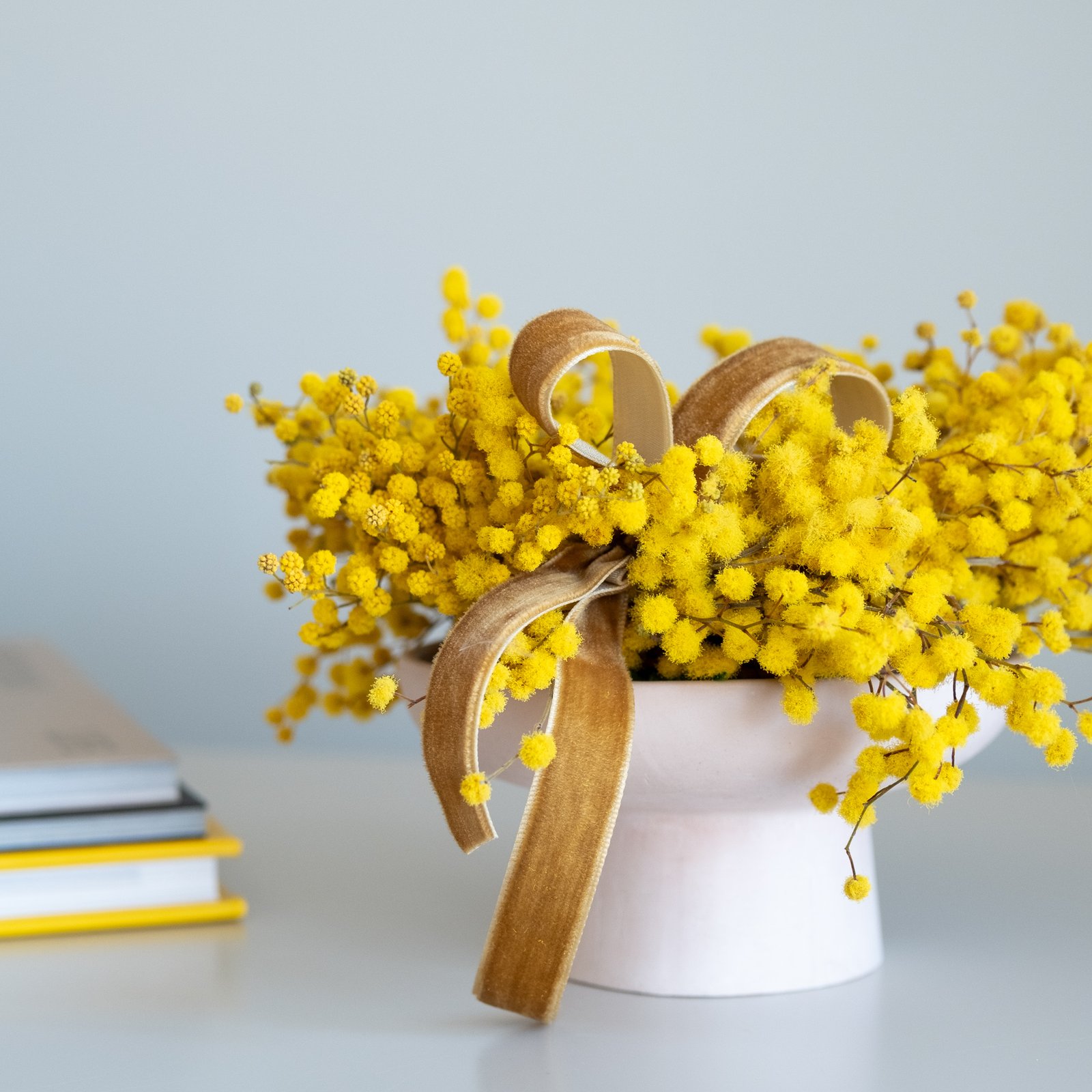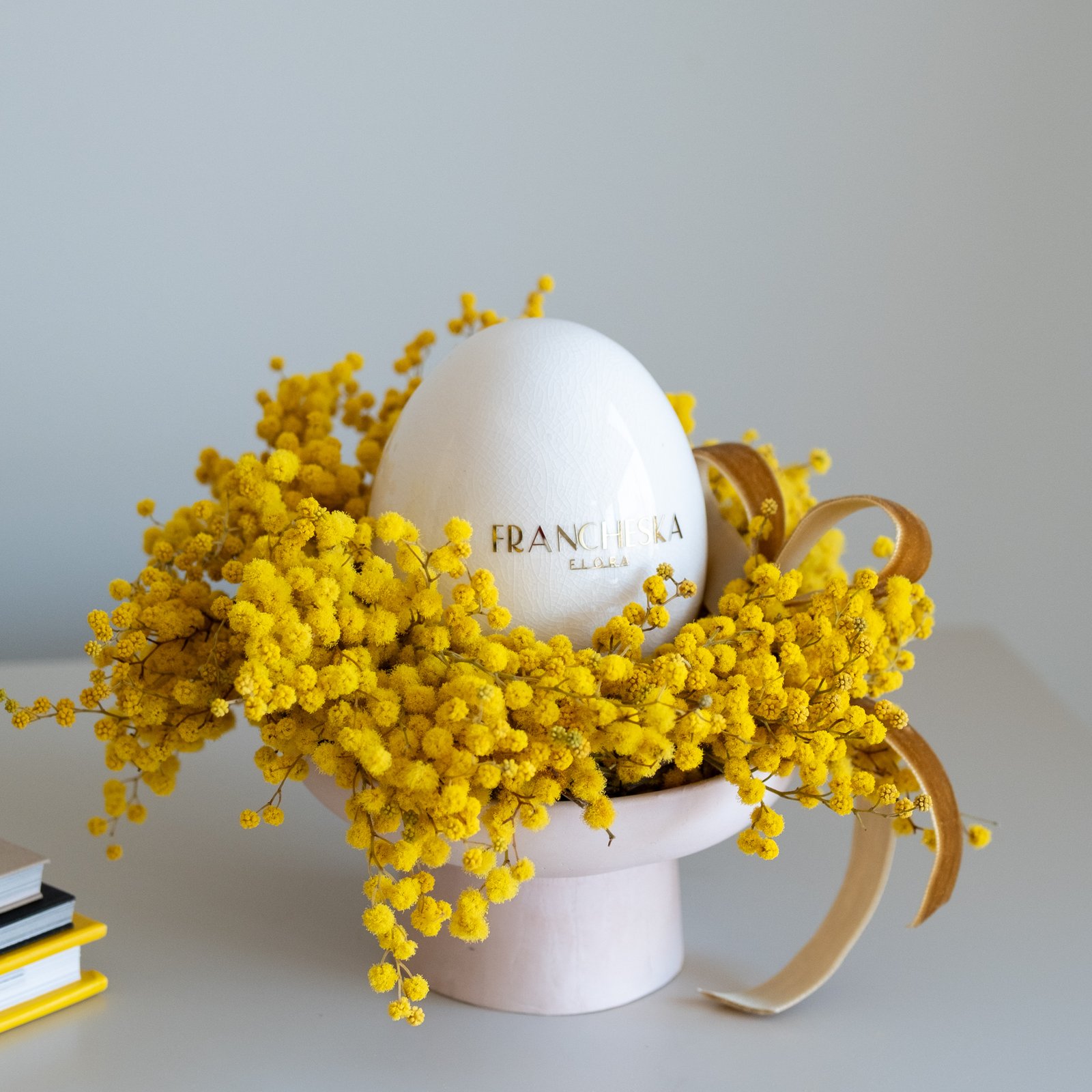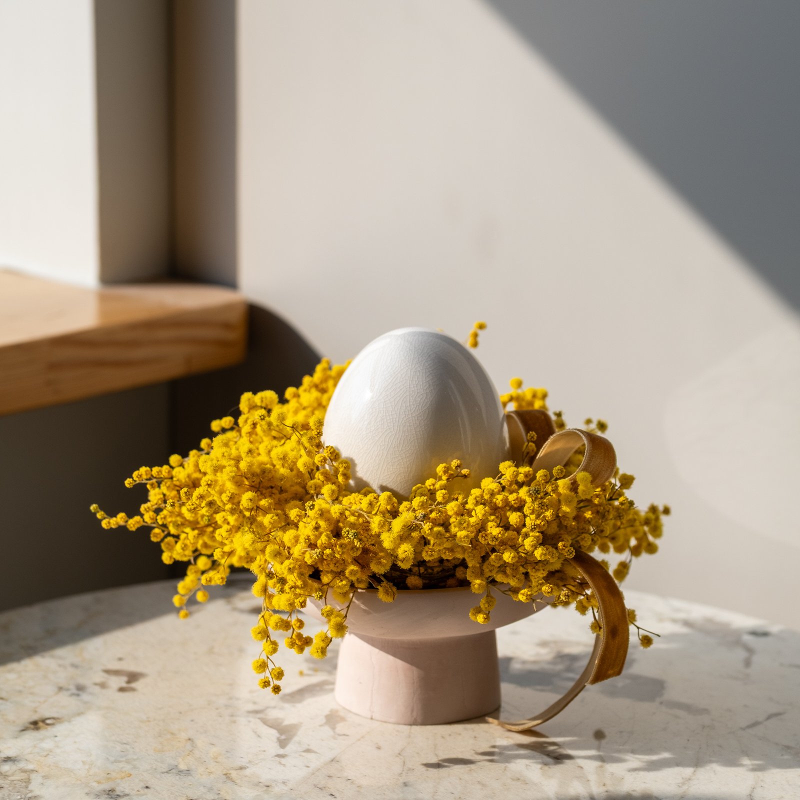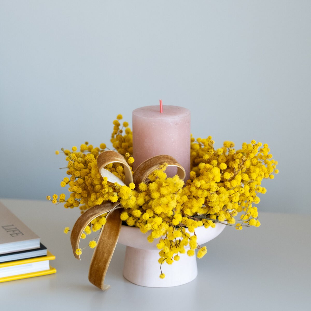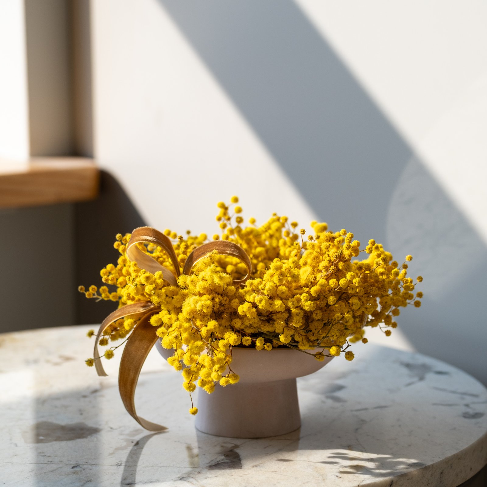 Subtili pavasarinė kompozicija iš stabilizuotos mimozos – lengva, šilta ir kupina saulėtos nuotaikos. Švelnūs geltoni žiedeliai suteikia namams jaukumo ir primena pirmąsias pavasario dienas.