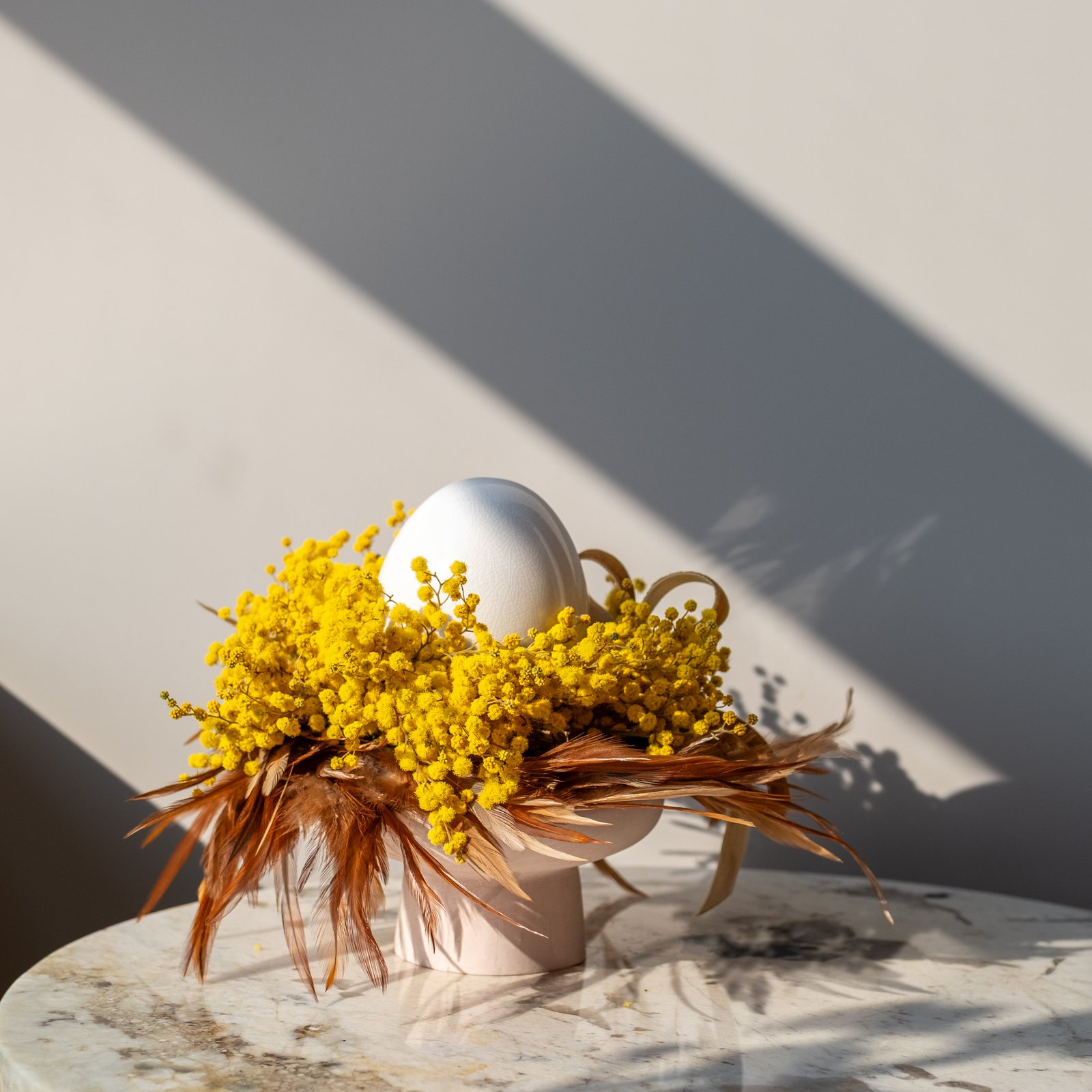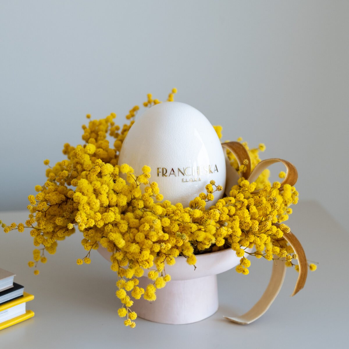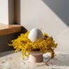 Kompozicija gali būti dekoruota žvake arba keraminiu kiaušiniu, todėl puikiai tinka ir Velykų laikotarpiui – kaip elegantiška stalo ar interjero dekoracija.