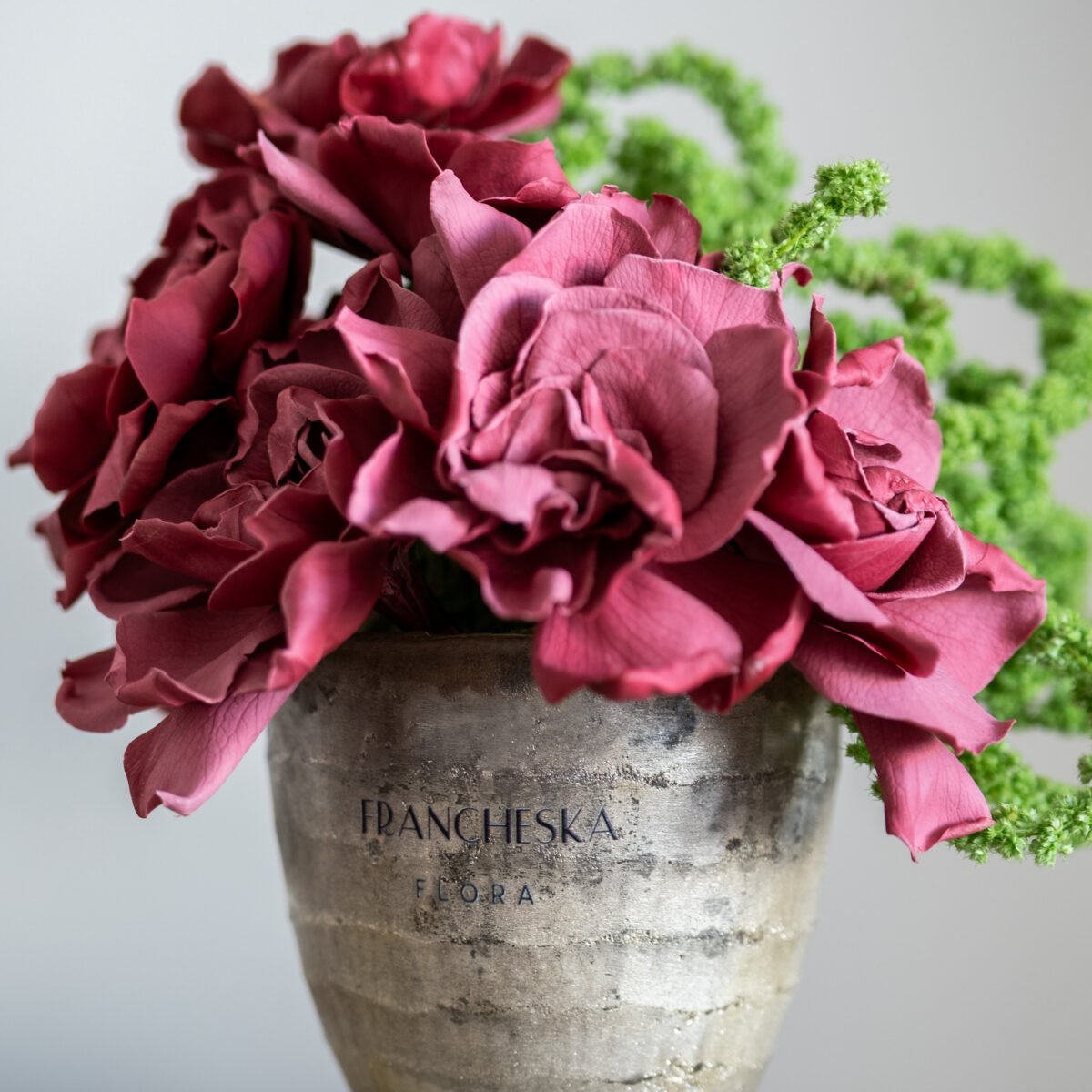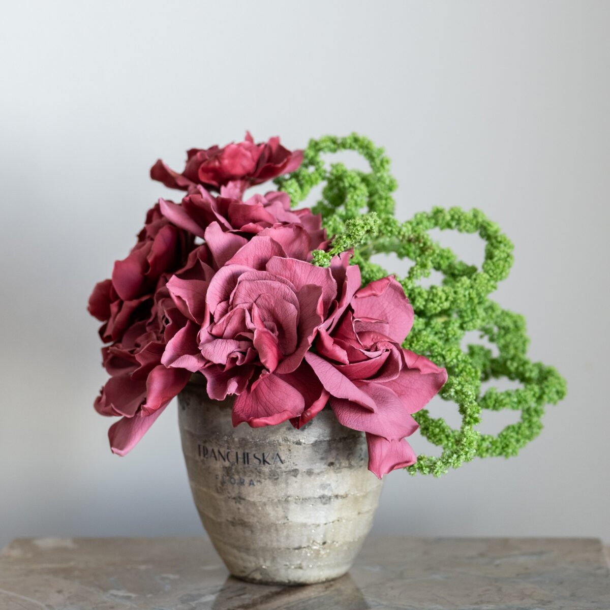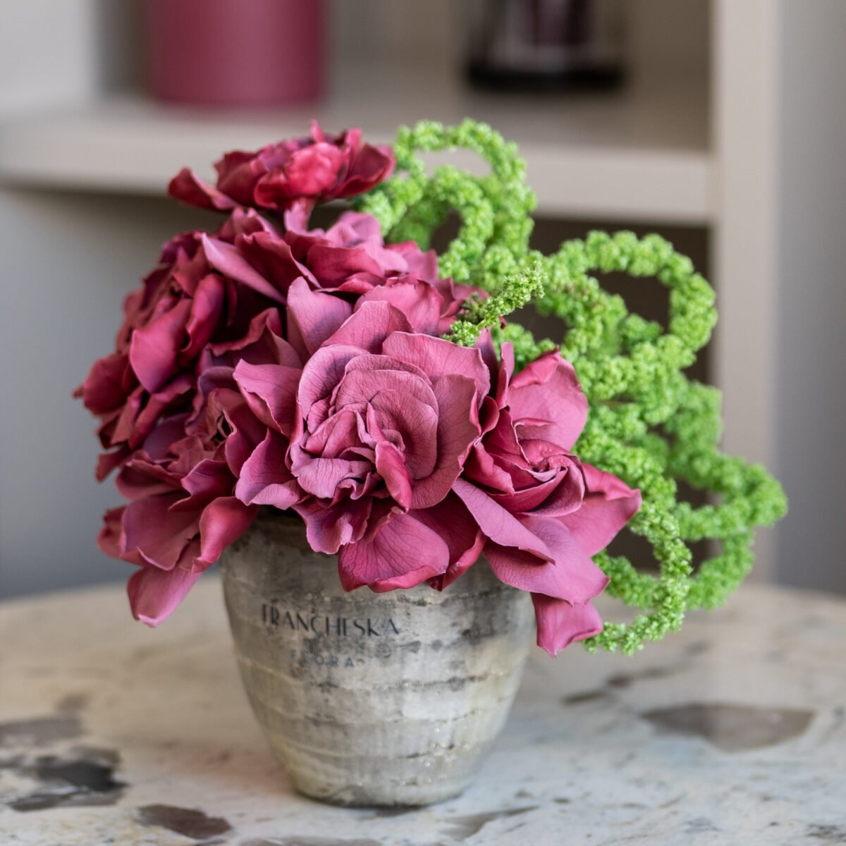 Stabilizuotų bordo 7 gardenijų kompozicija – difuzorius su amarantais