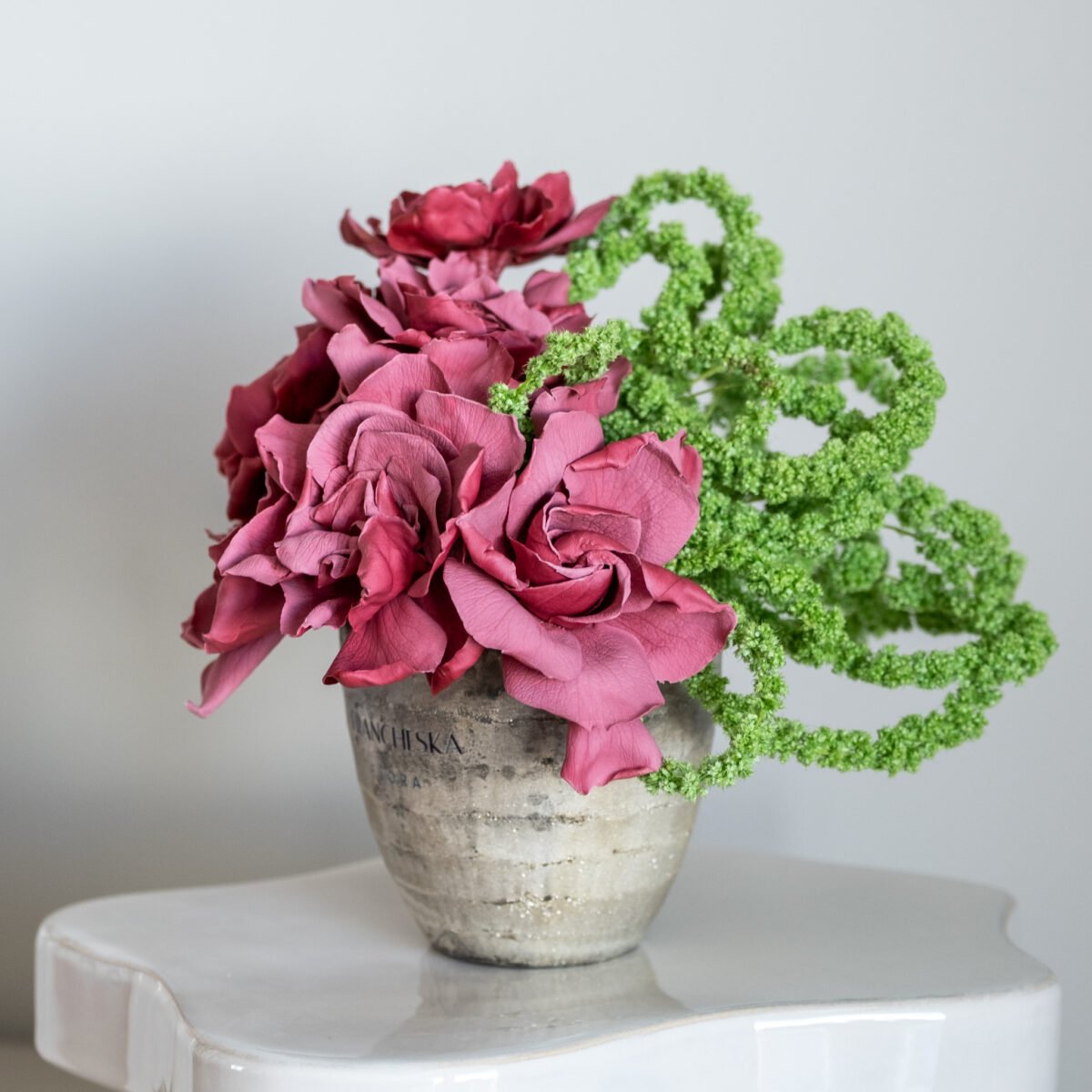 Kompozicija iš stabilizuotų gardenijų – ne tik interjero puošmena, bet ir subtilus difuzorius mažoms erdvėms, tokioms kaip vonios kambarys ar miegamasis.