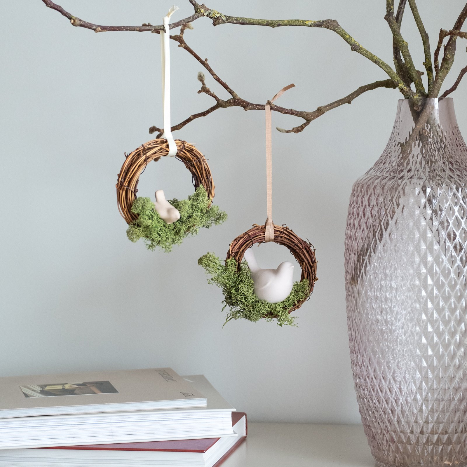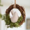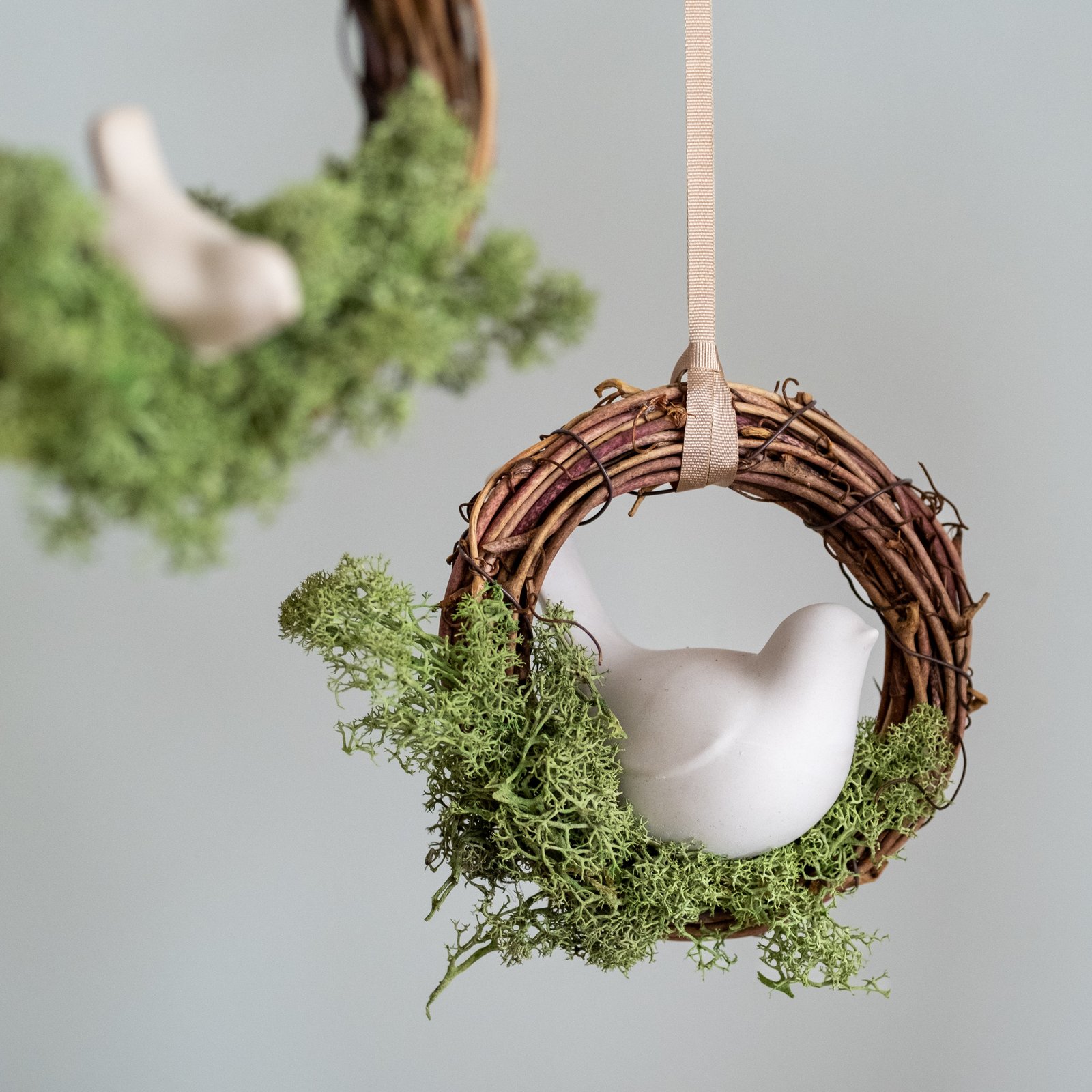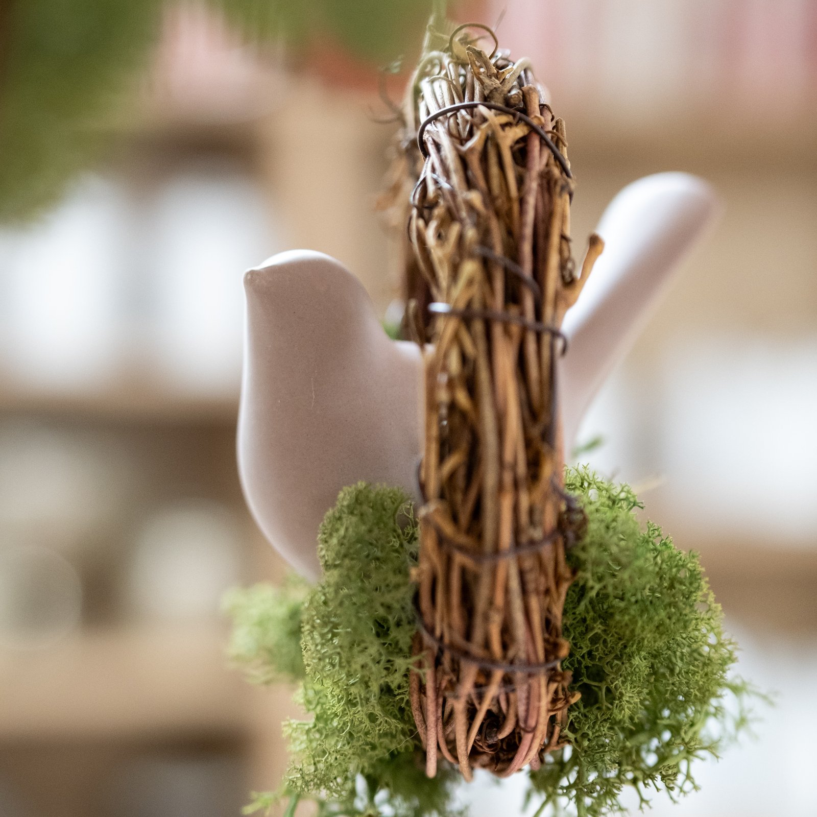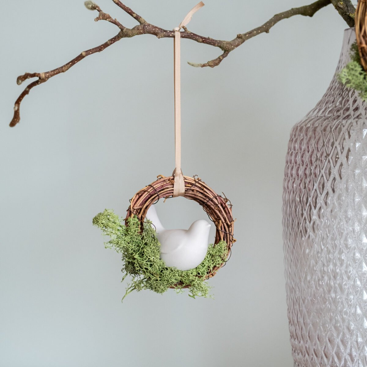 Subtilus velykinis vainikėlis, sukurtas iš natūralios vynuogių vytelių. Kompoziciją papildo stabilizuotos samanos ir  gipso paukštelė, kuri suteikia dekorui švelnumo bei pavasariškos nuotaikos.