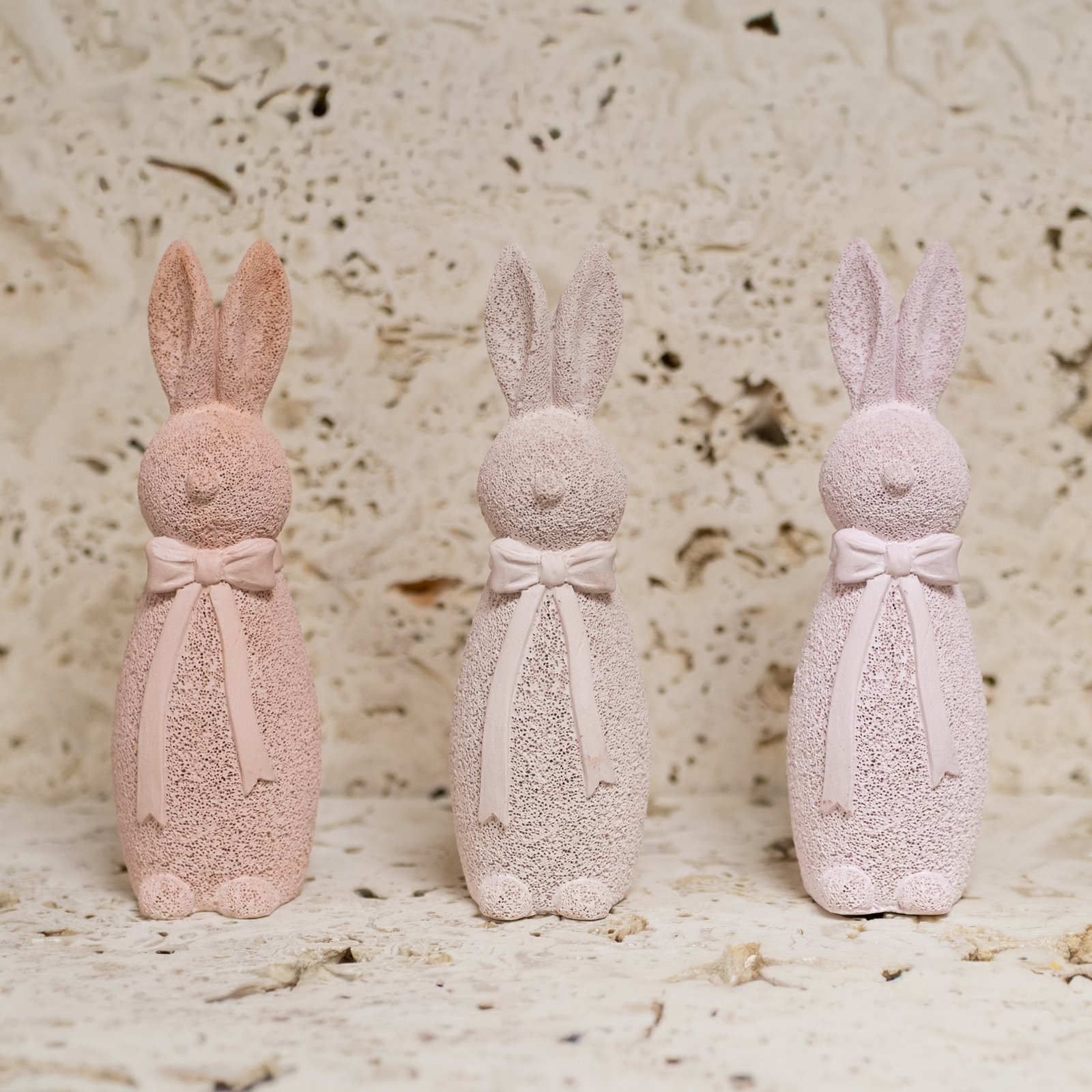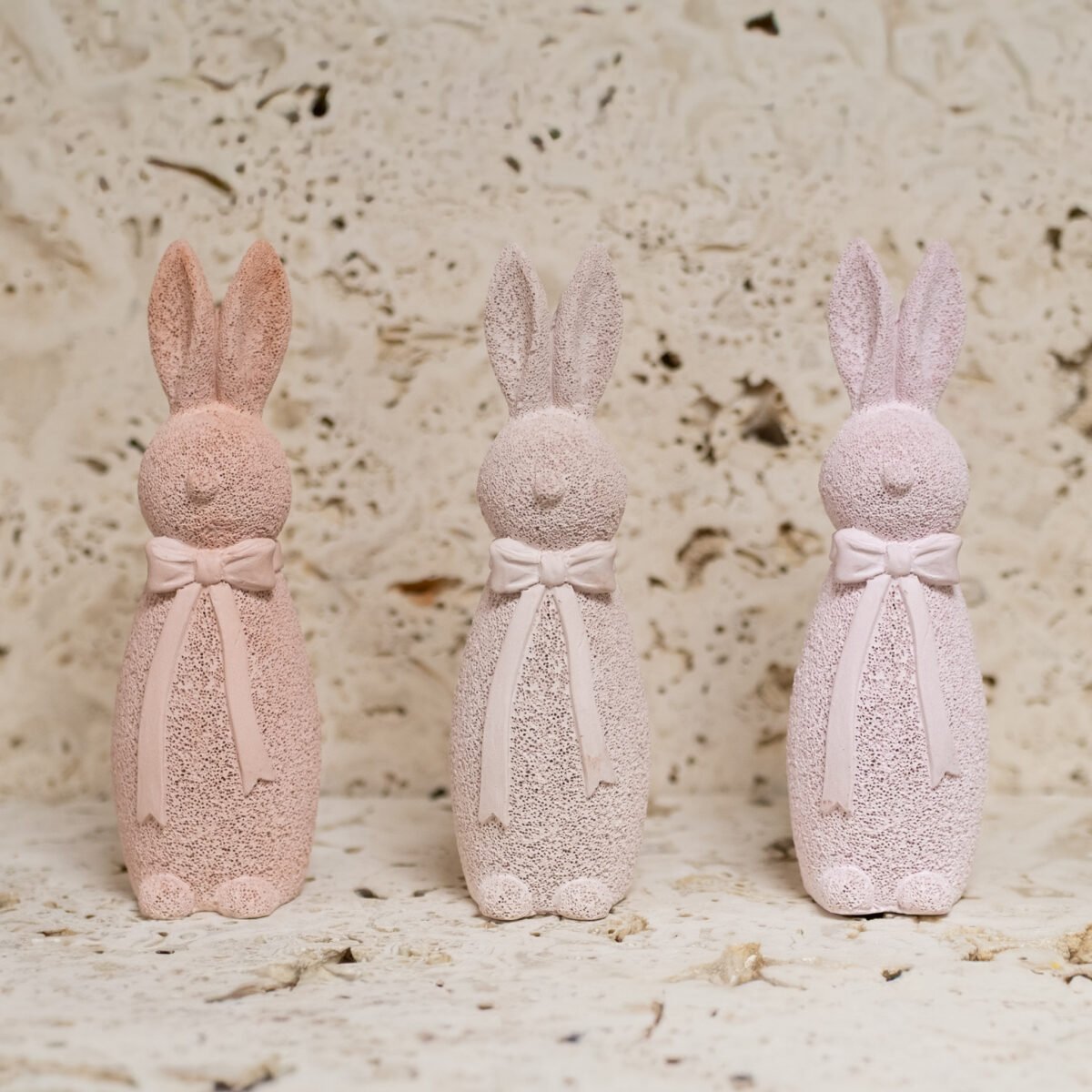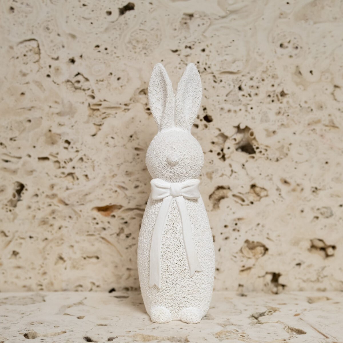 Elegantiškas ir švelnus dekoratyvinis zuikutis, pagamintas iš gipso. Išskirtinė, lengvai faktūrinė paviršiaus tekstūra ir subtilus kaspinas suteikia jam ypatingo žavesio bei jaukumo.