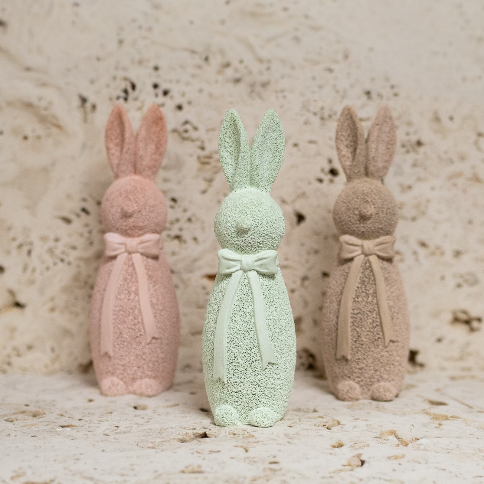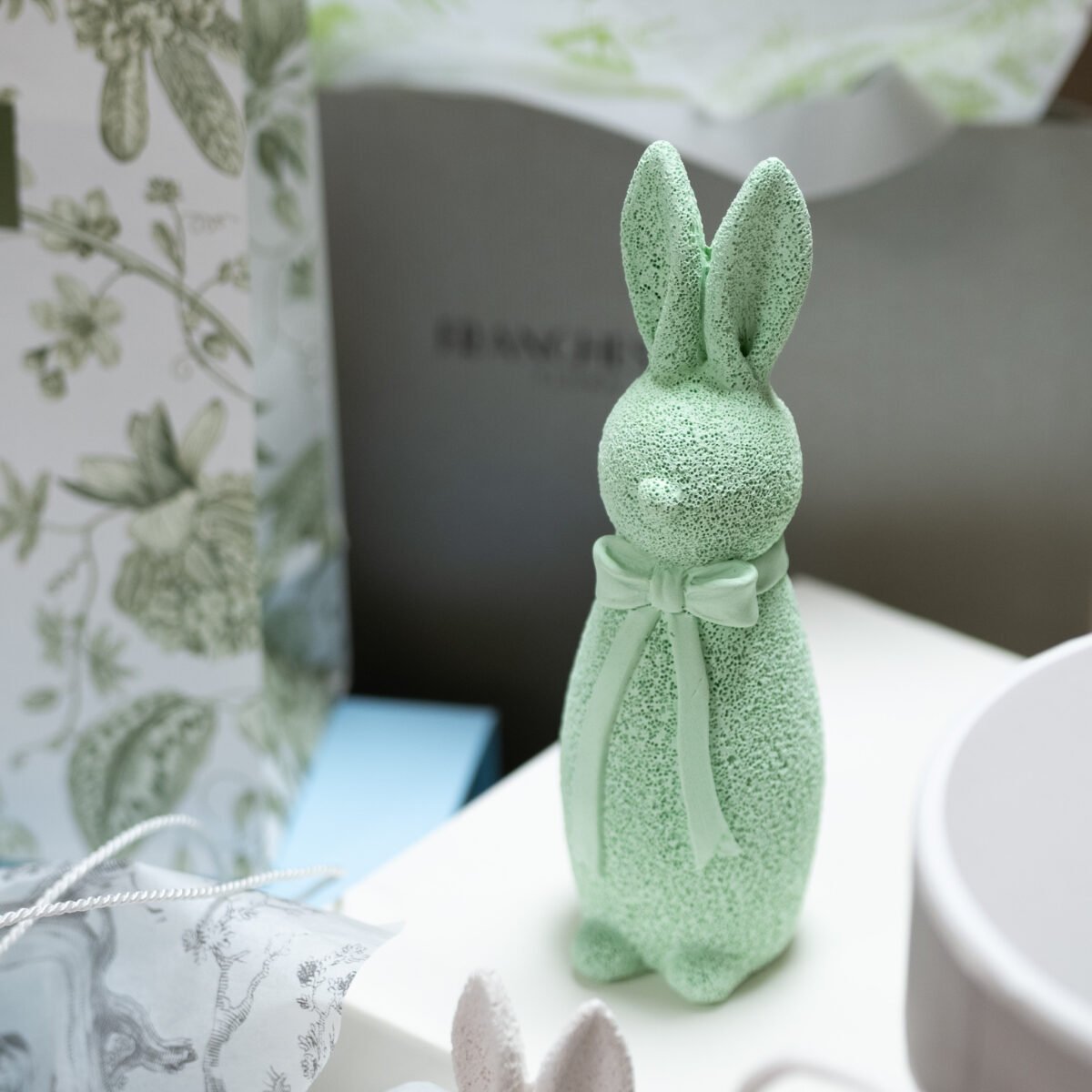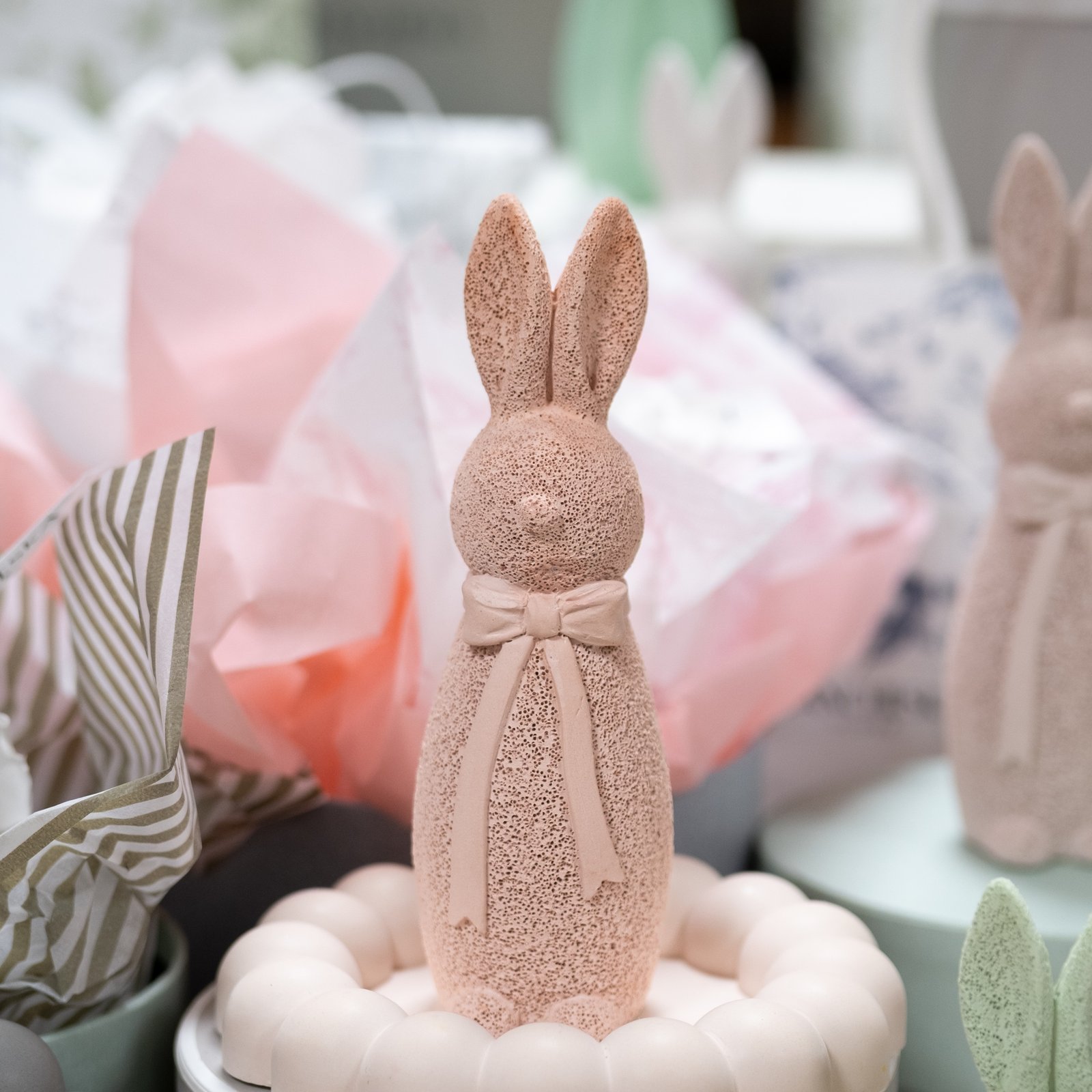 Elegantiškas ir švelnus dekoratyvinis zuikutis, pagamintas iš gipso. Išskirtinė, lengvai faktūrinė paviršiaus tekstūra ir subtilus kaspinas suteikia jam ypatingo žavesio bei jaukumo.