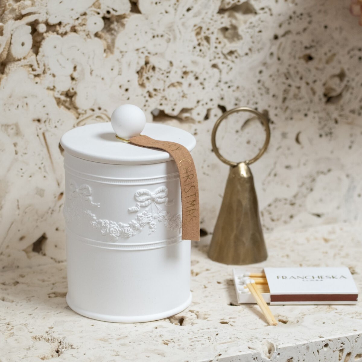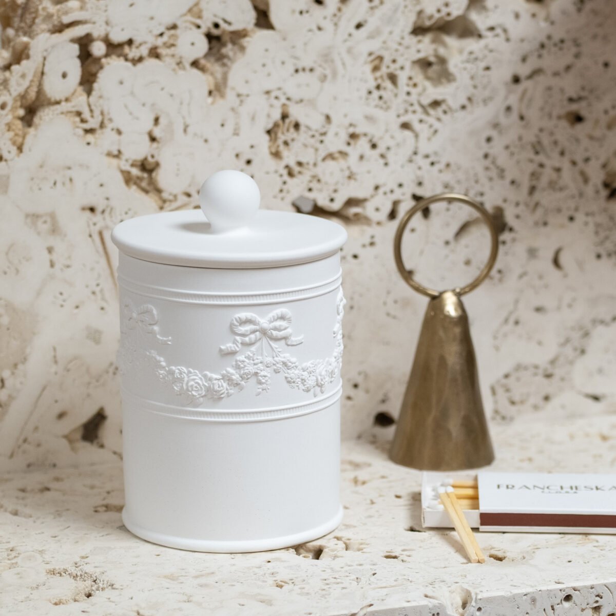„Rococo”- rankų darbo aromatinė žvakė išskirtiniame rankų darbo gipso indelyje, žaismingais kaspinais ir gėlių girliandomis, kupinos lengvumo, švelnumo ir prašmatnumo.
